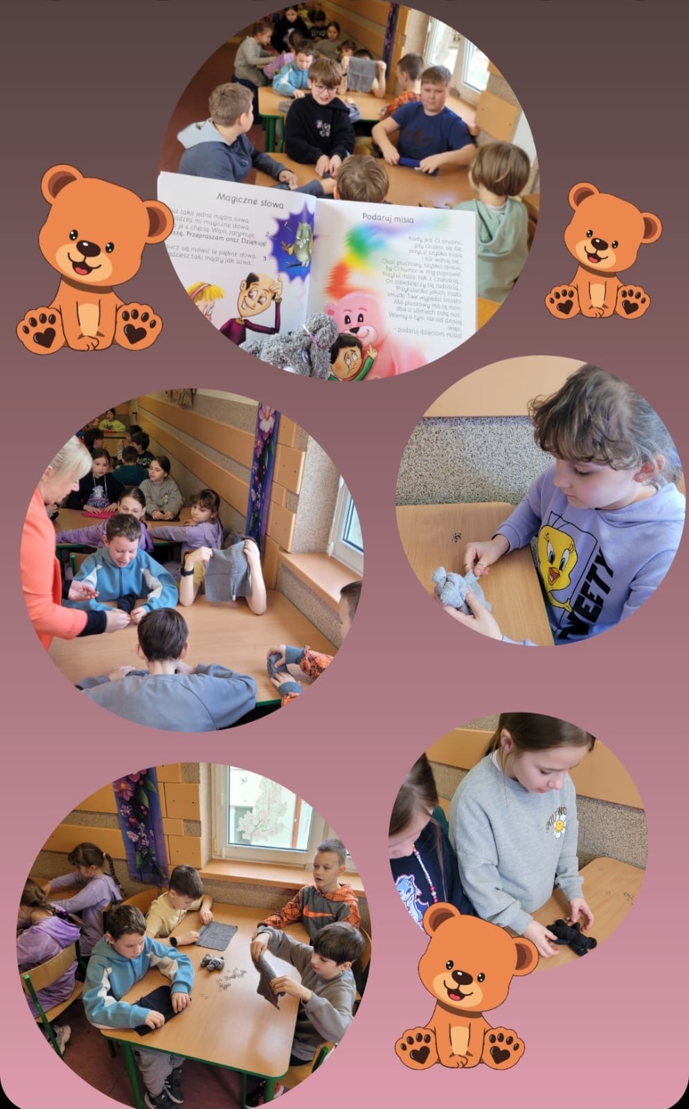 W tym roku szkolnym, w świetlicy klas 3-8 realizowana jest innowacja pedagogiczna pt. „RyMy w Siódemce gościmy”. W ramach działań „bawimy” się wierszami naszej lokalnej pisarki p. Moniki Kajdy, autorki rymowanych i bajecznie zilustrowanych książek dla dzieci. Do tej pory poznaliśmy kilkanaście różnych wierszy- niektóre bawiły nas do łez, inne wzruszały i uczyły. Podczas ostatnich zajęć odczytalismy i omówiliśmy wspólnie wiersz „Podaruj Misia”.