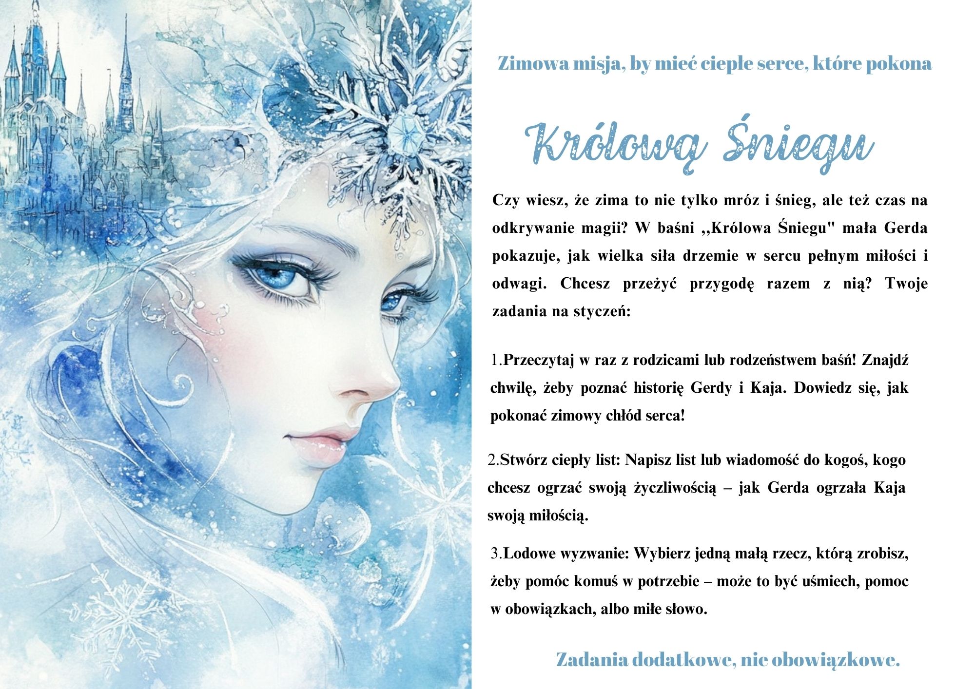 W tym miesiącu zapraszam do przeczytania baśni Hansa Christiana Andersena „Królowa Śniegu”. Zadania obowiązkowe i dla chętnych opisane zostały na zdjęciach.