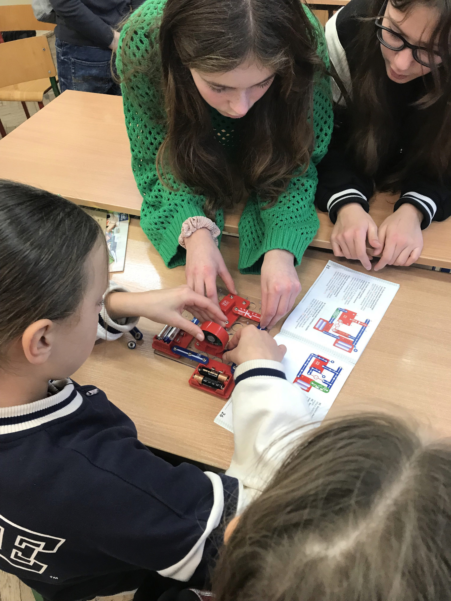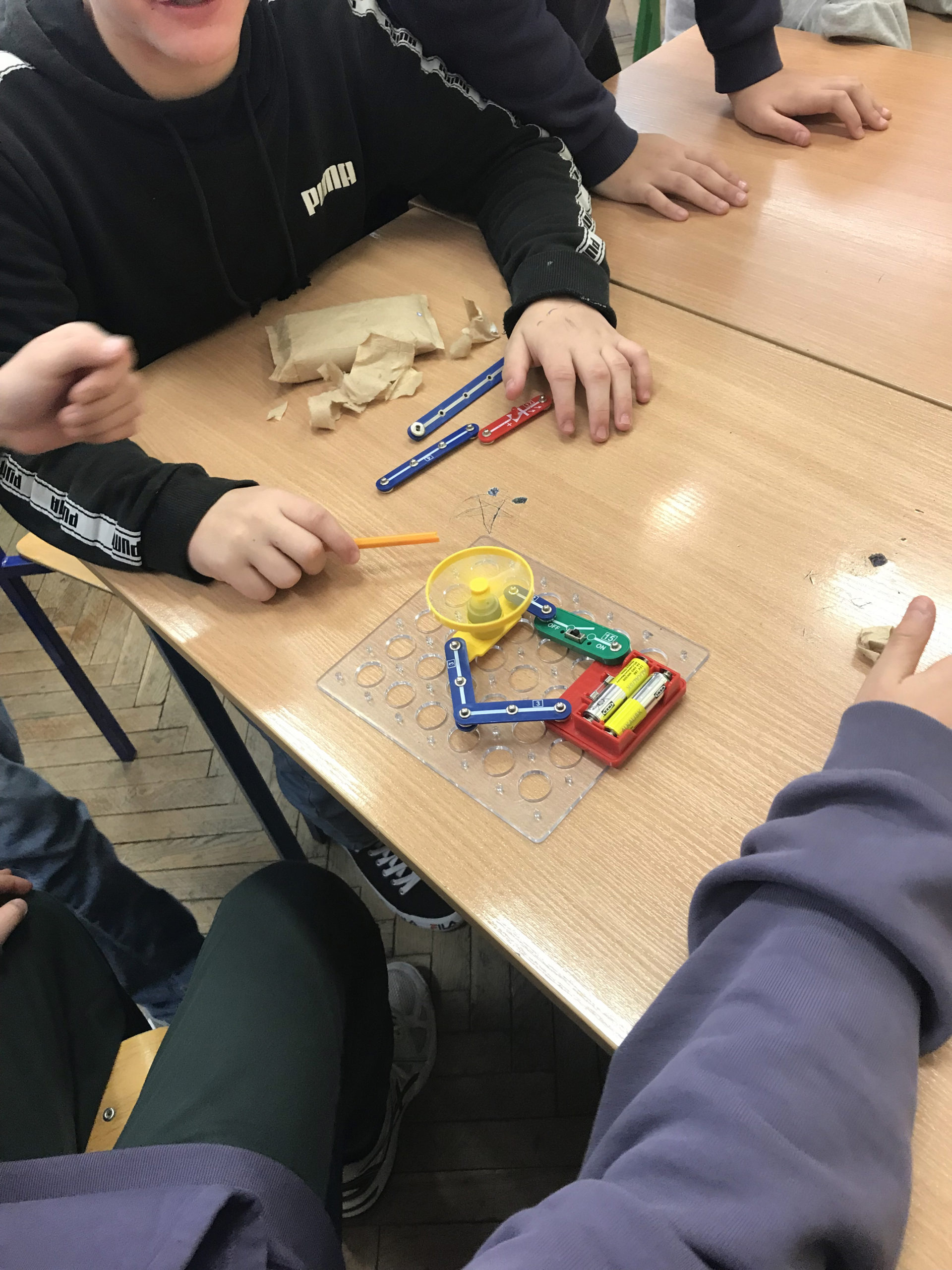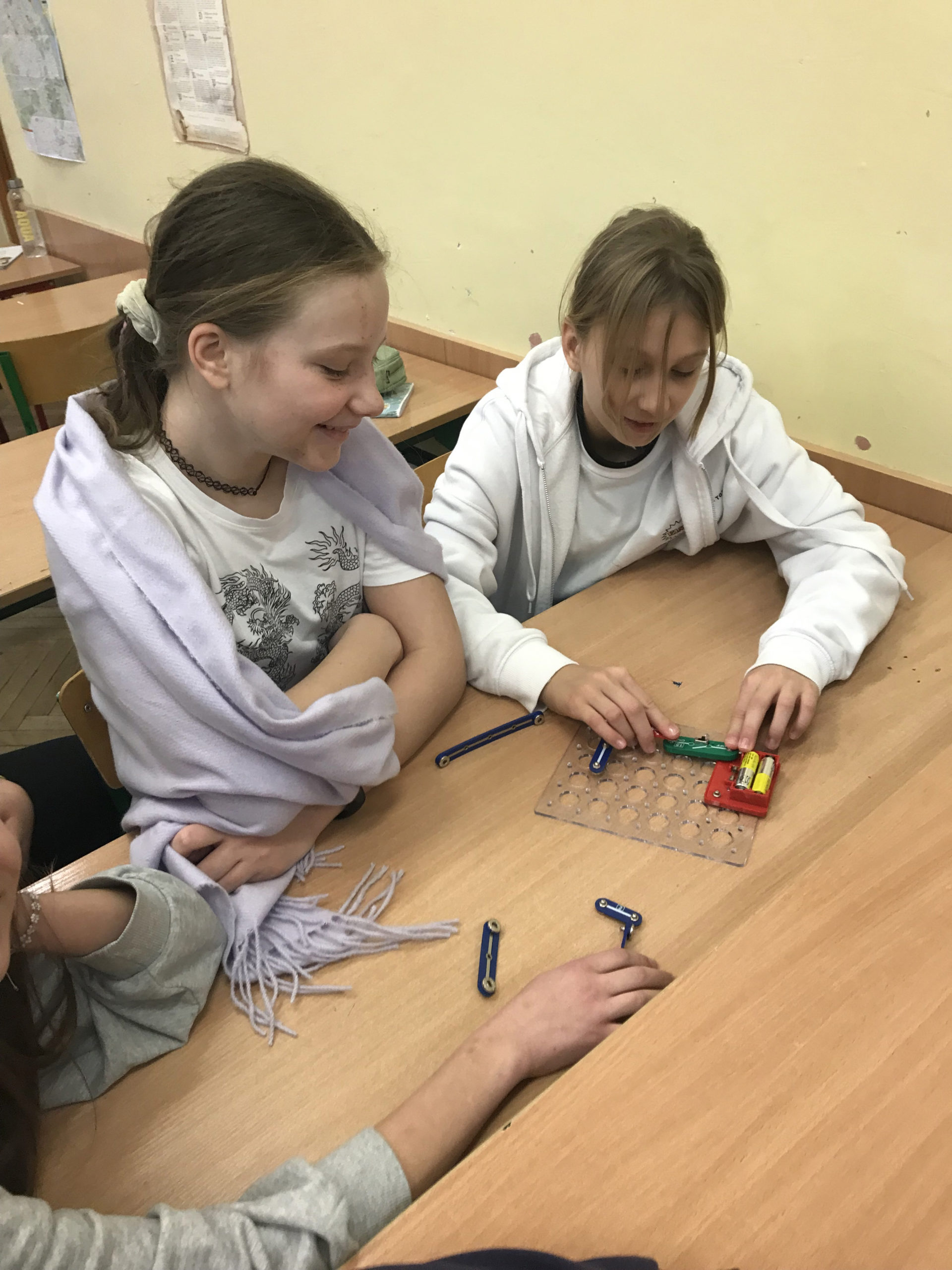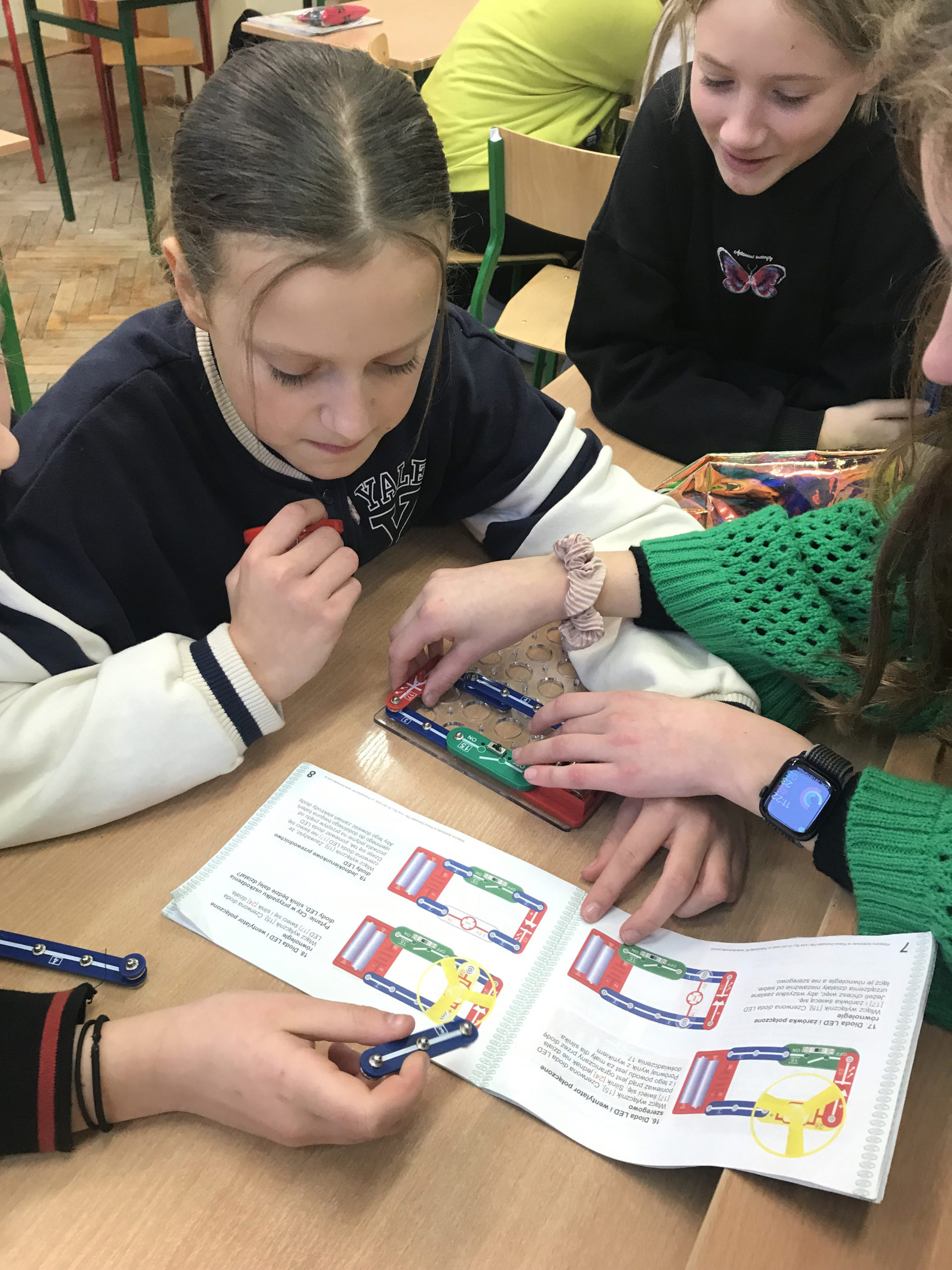 Na lekcjach techniki uczniowie klasy szóstej konstruowali proste obwody elektryczne. Bezpieczna zabawa z prądem opierała się na zbudowaniu według instrukcji konkretnych schematów. Uczniowie mieli okazję poznać reguły łączenia poszczególnych elementów obwodu: baterii, wirnika, żarówki, żarówki iluminacyjnej, wyłącznika, silniczka. Młodzież podłączając również wybrane przedmioty codziennego użytku mogła zbadać przewodnictwo prądu elektrycznego. Lekcja była bardzo interesująca, wielkie podziękowania dla ucznia klasy- Julka za zaopatrzenie klasy w niezbędne przyrządy i pomoc merytoryczną.