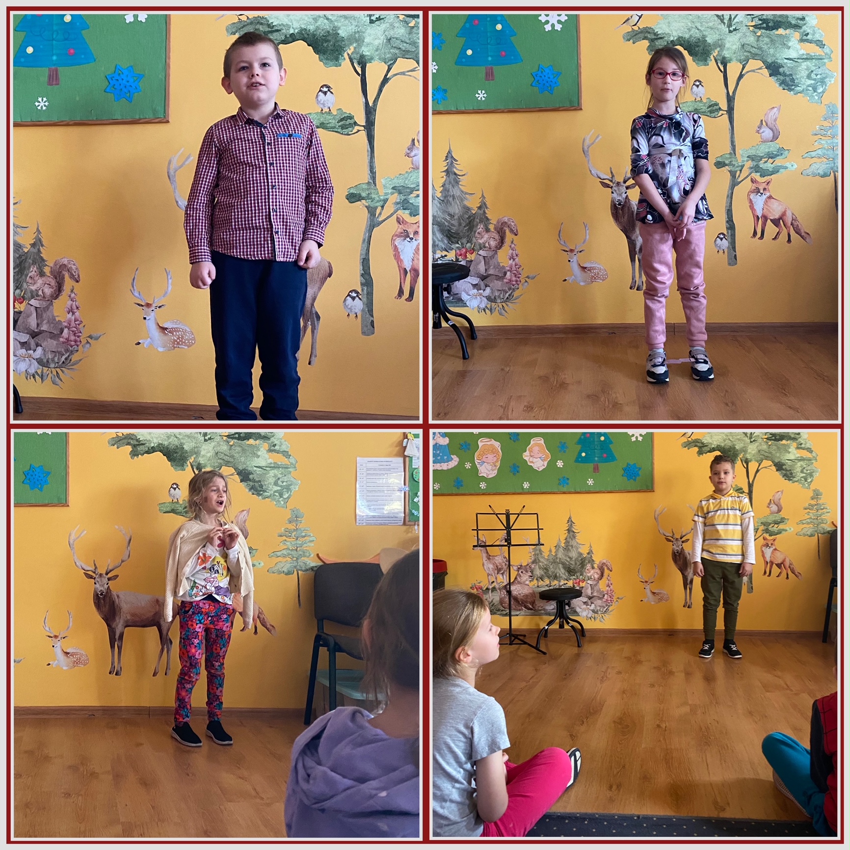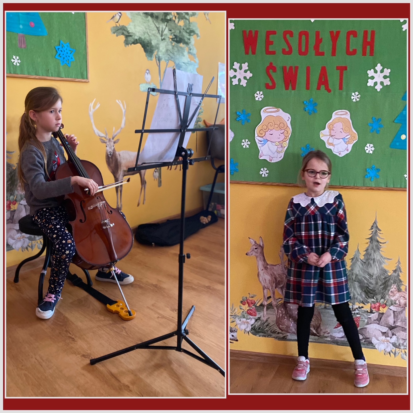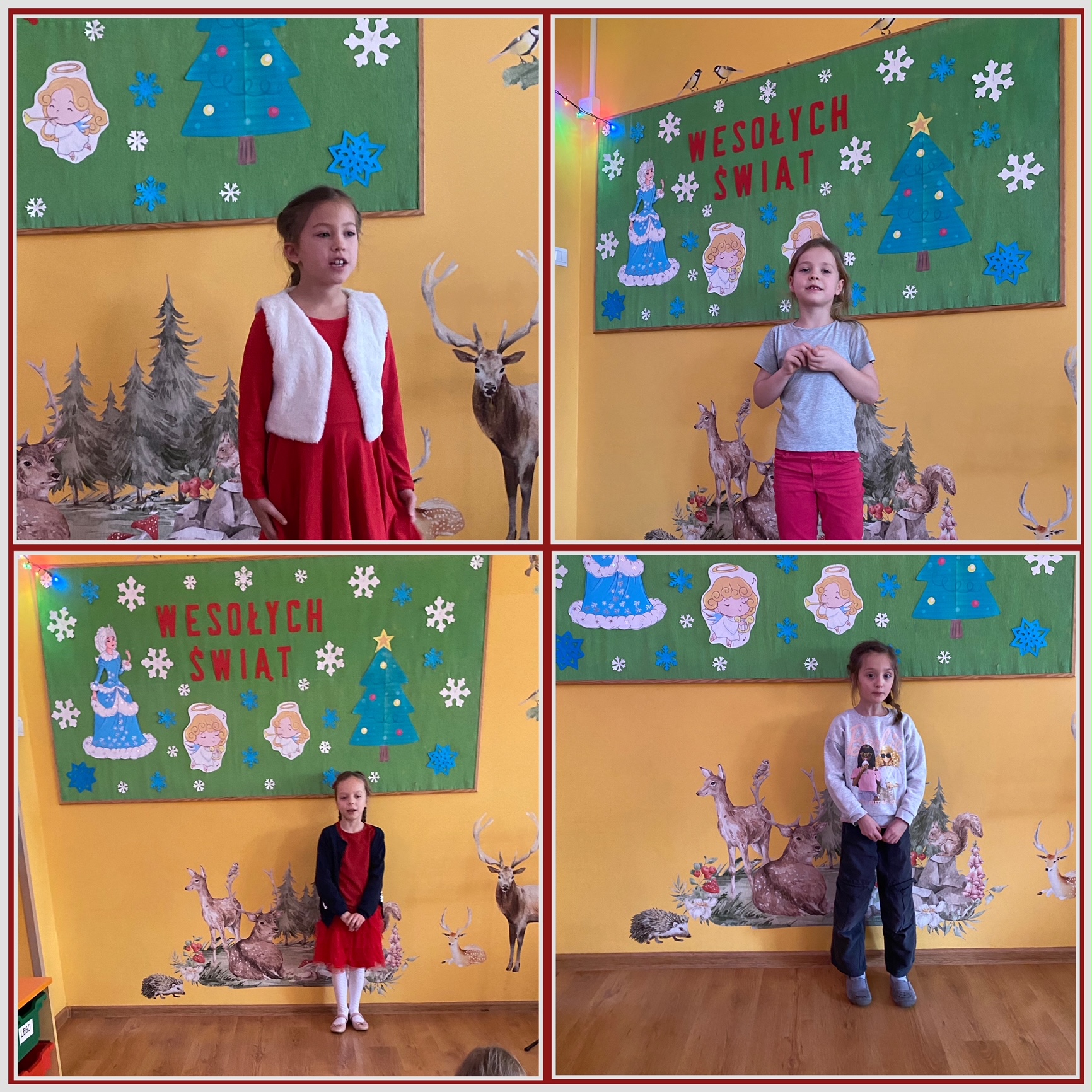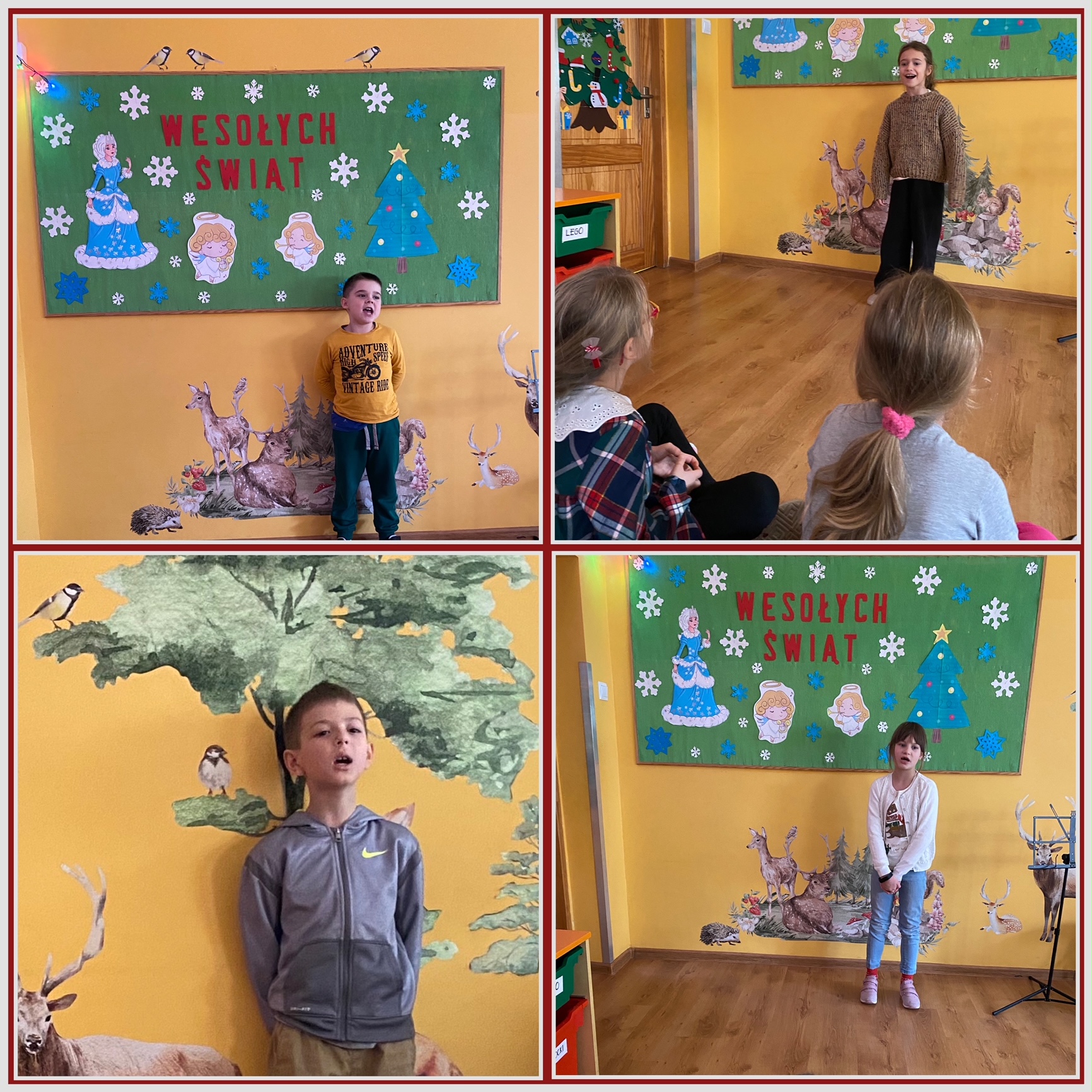 Na zdjęciach widać dzieci śpiewające solo kolędy, w tle zielona tablica z napisem wesołych świąt, oraz aniołkami, choinkami i śnieżynkami.