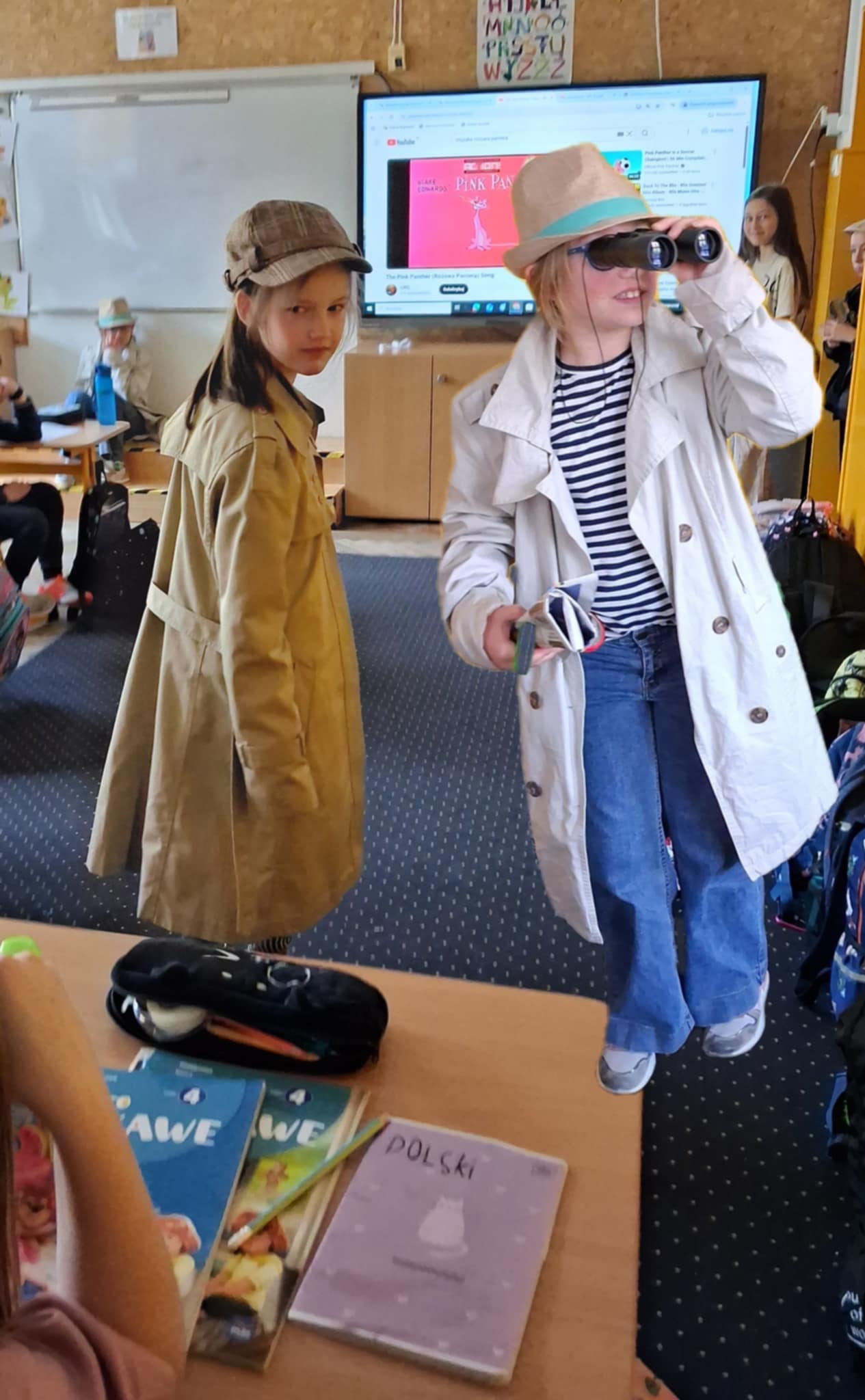 Na tle ekranu, w klasie stoi czworo dzieci. Ubrane sa w płaszcze, bluzy- przebrane są za detektywa Pozytywkę. Trzy osoby mają na głowach czapki, a w rękach trzymaja przedmioty, które kojarąa się z pracą detektywa.