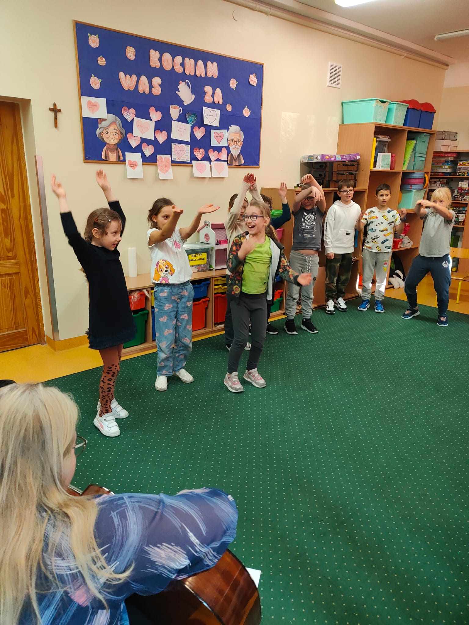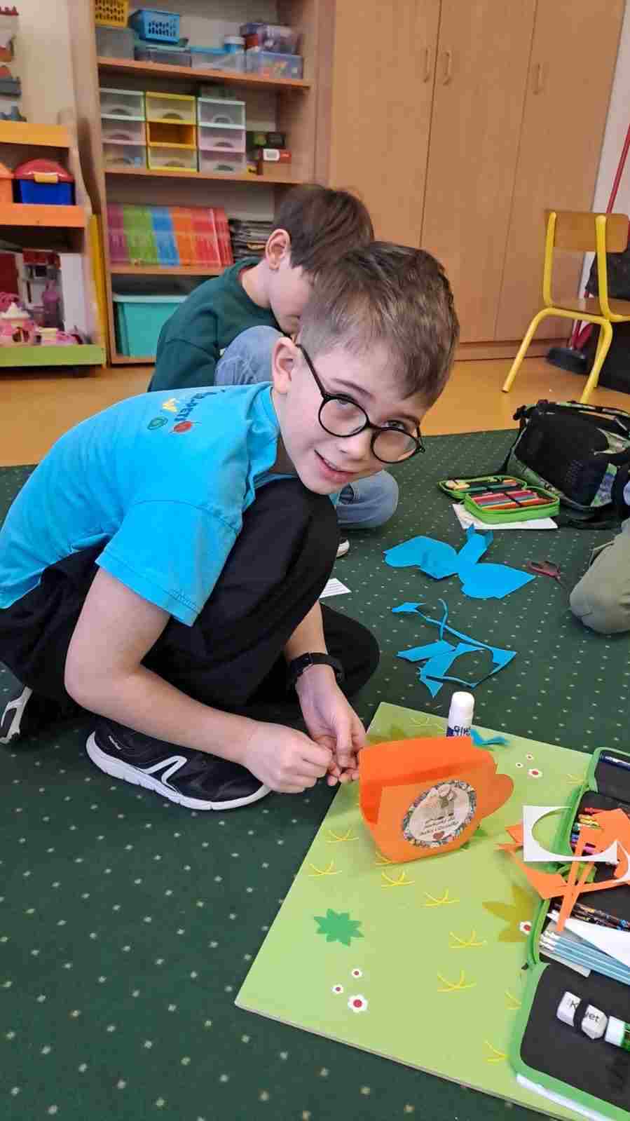i obdarowujemy prezentami. Świetliczaki klas 2 podczas zajęć przygotowują się na wspólne świętowanie i z tej okazji przygotowali upominki, rysowali serduszka, w których opisywali za co kochają Babcię i Dziadka. Serduszka udekorowały tablicę tematyczną “Kocham Was za…”
