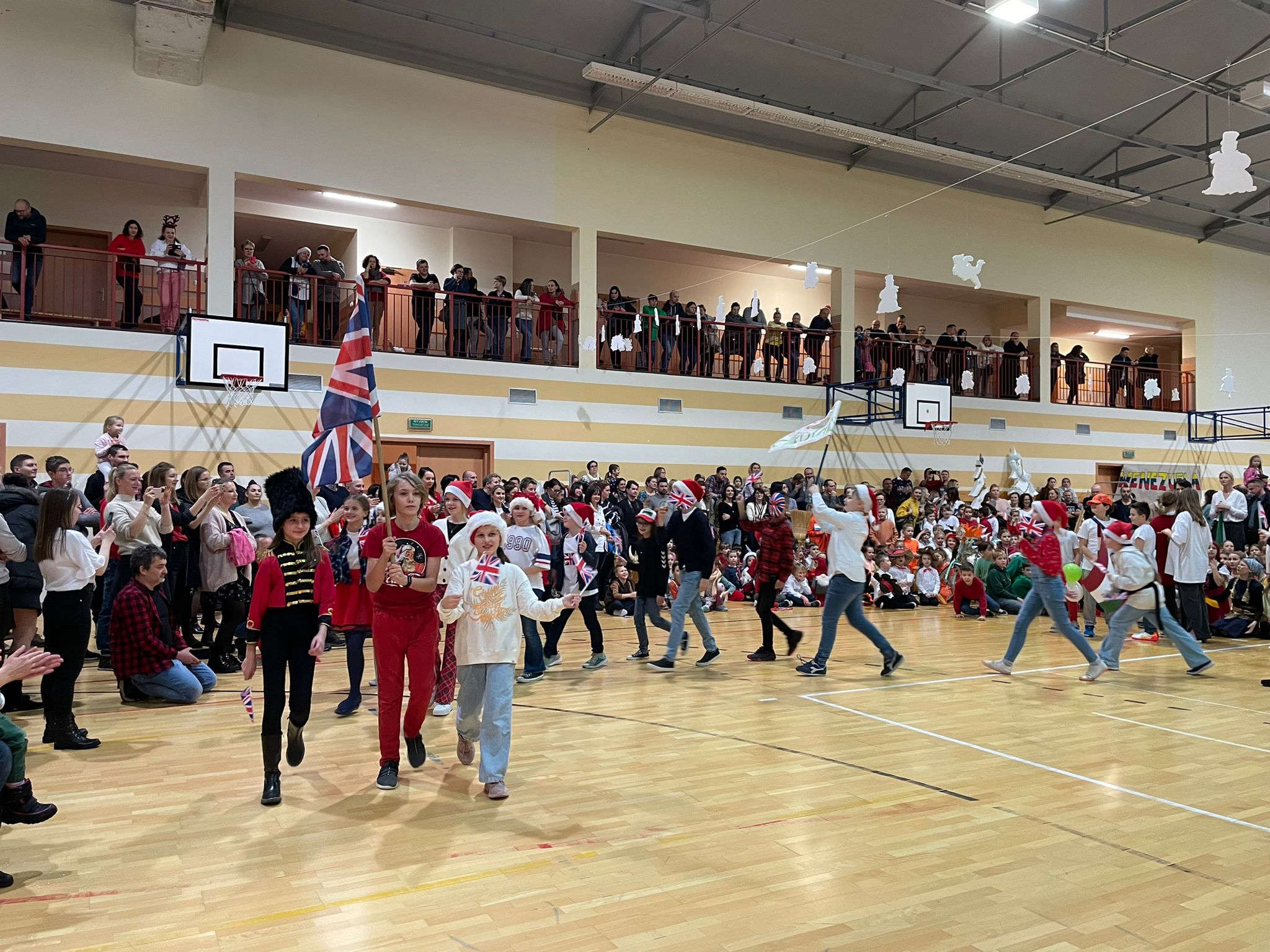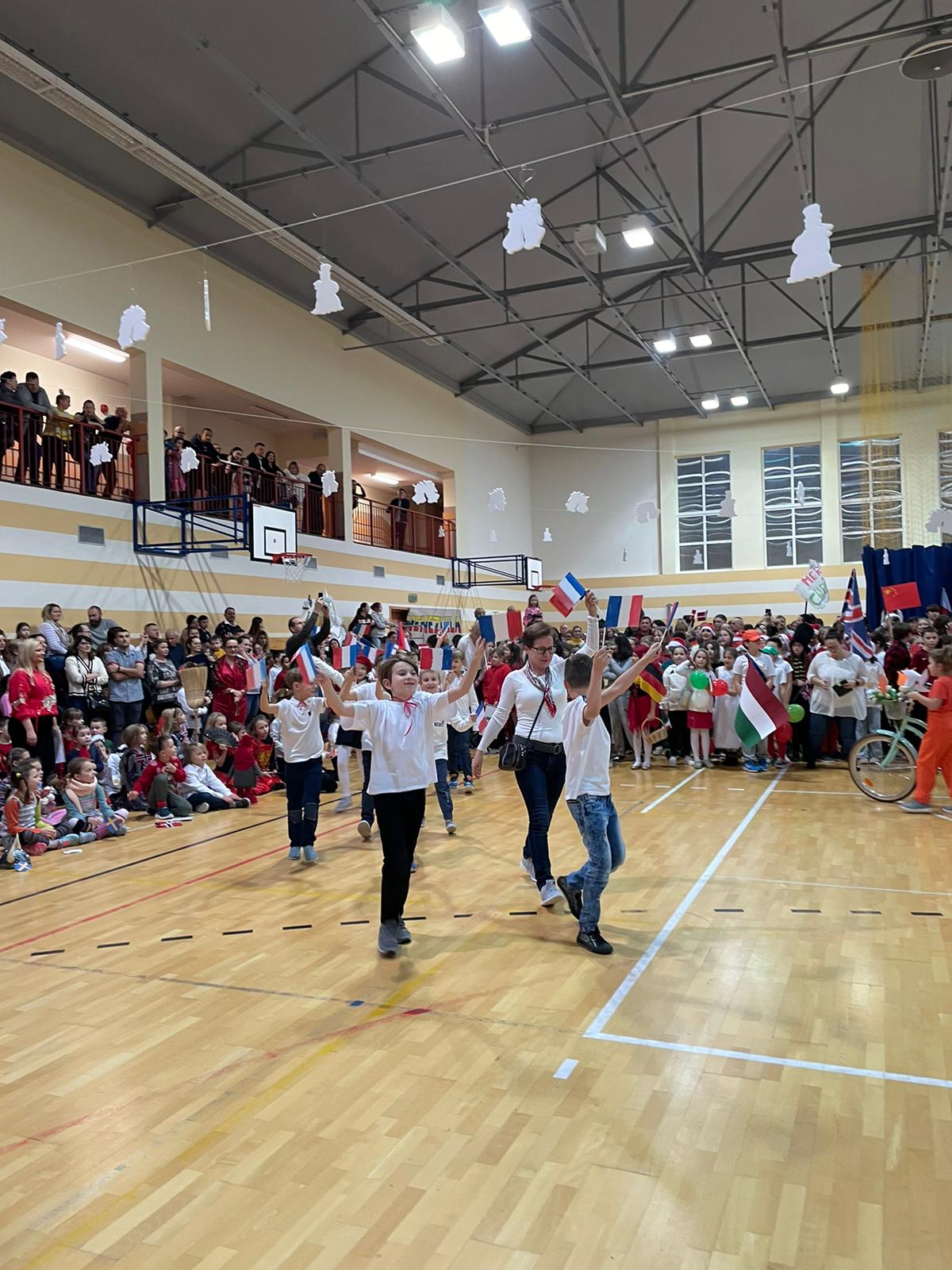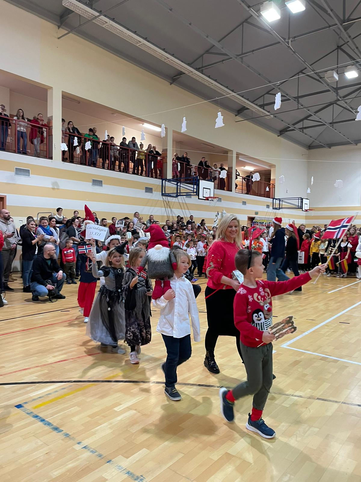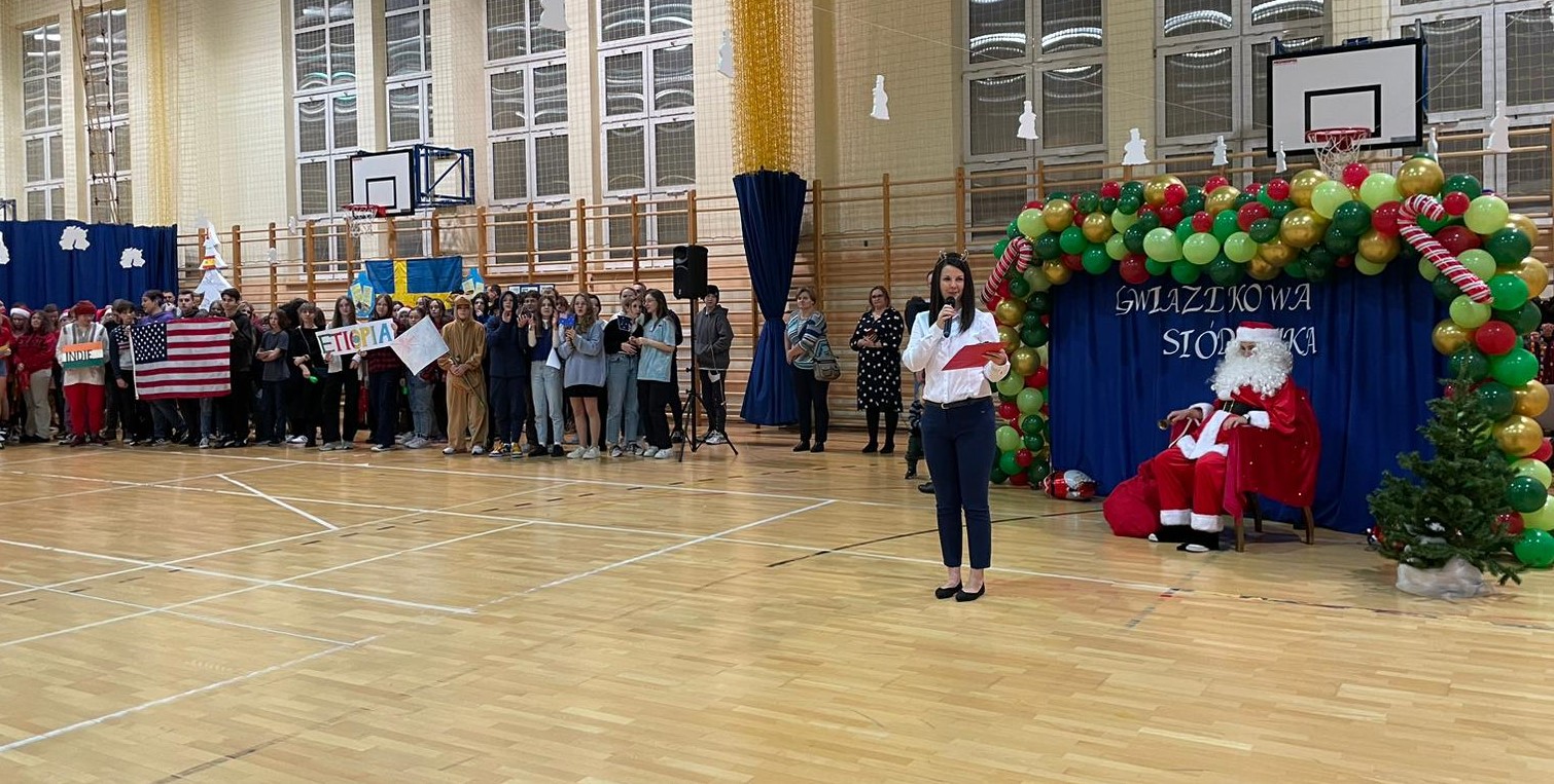 Po rozpoczęciu imprezy i przywitaniu wszystkich gości, oddaliśmy głos dziewczętom klas 8, które piosenką „Rockin’ Around the Christmas Tree” wprowadziły nas w prawdziwie świąteczny nastrój. Bez wątpienia ogromną atrakcją naszego festynu był korowód państw, w którym każda klasa prezentowała wybrany kraj i składała wszystkim świąteczne życzenia w ich języku. Po części artystycznej odbyliśmy kulinarną podróż dookoła świata, smakując potraw przygotowanych przez Rodziców naszych Uczniów na Kiermaszu Pyszności. Dodatkową atrakcją były warsztaty robienia świątecznych kartek z życzeniami z możliwością nadania ich dla naszej Siódemkowej Społeczności. Ogromnym zainteresowaniem cieszyła się również nasza Ścianka Gwiazdkowej Siódemki, na tle której odbywały się rodzinne i koleżeńskie sesje fotograficzne.