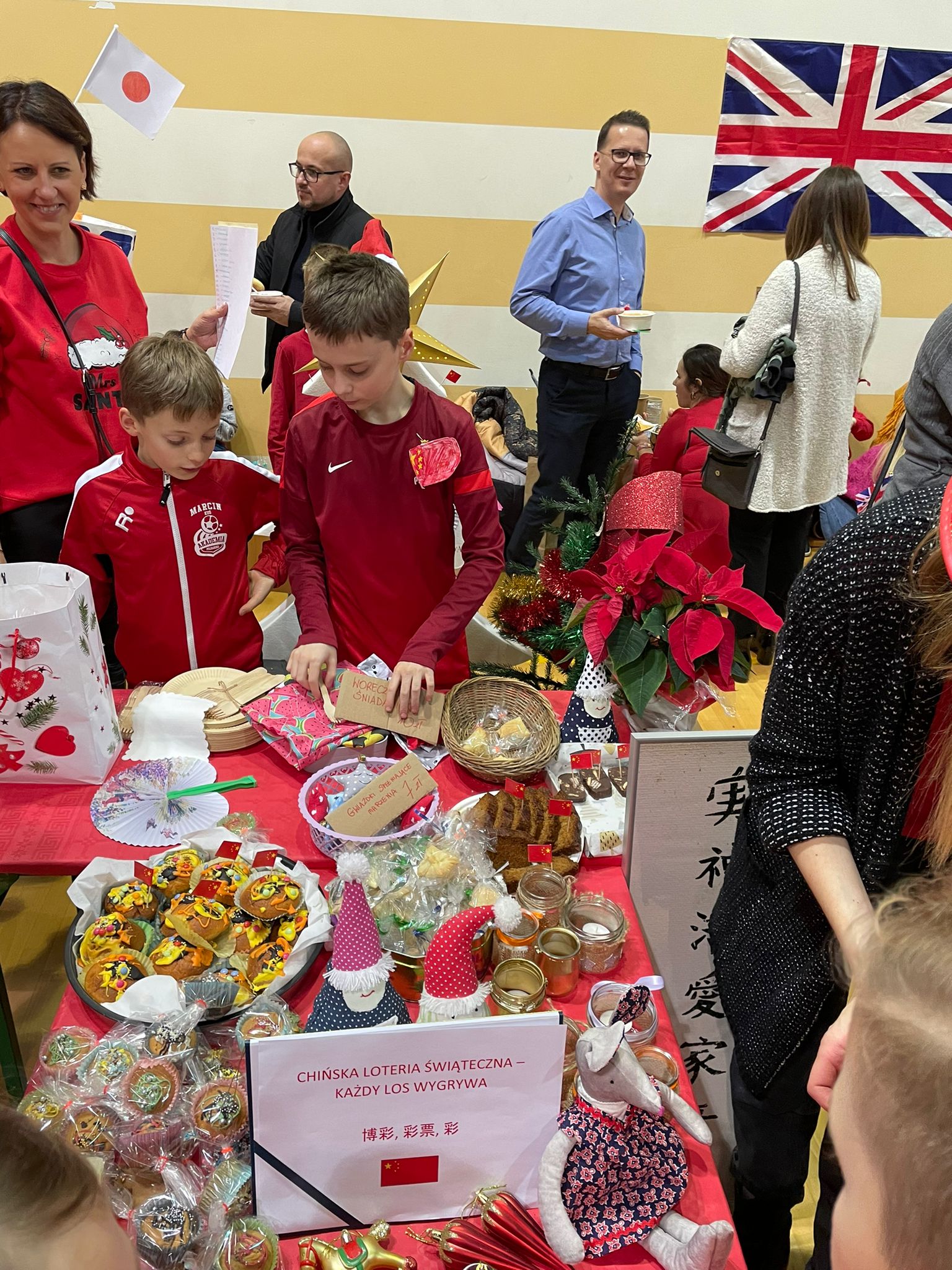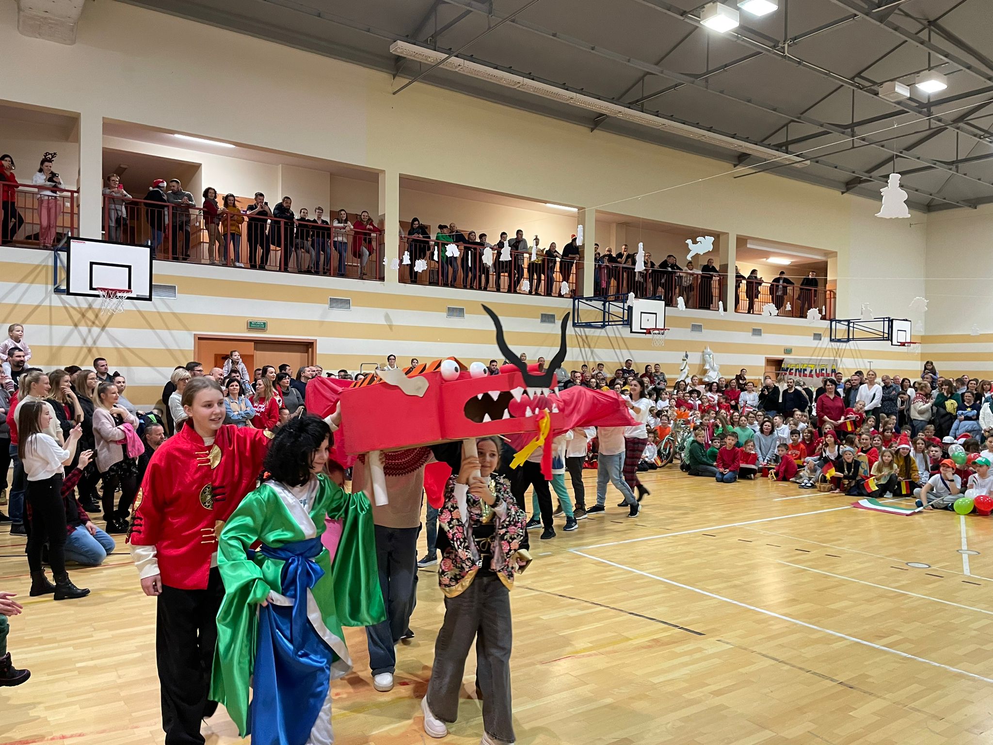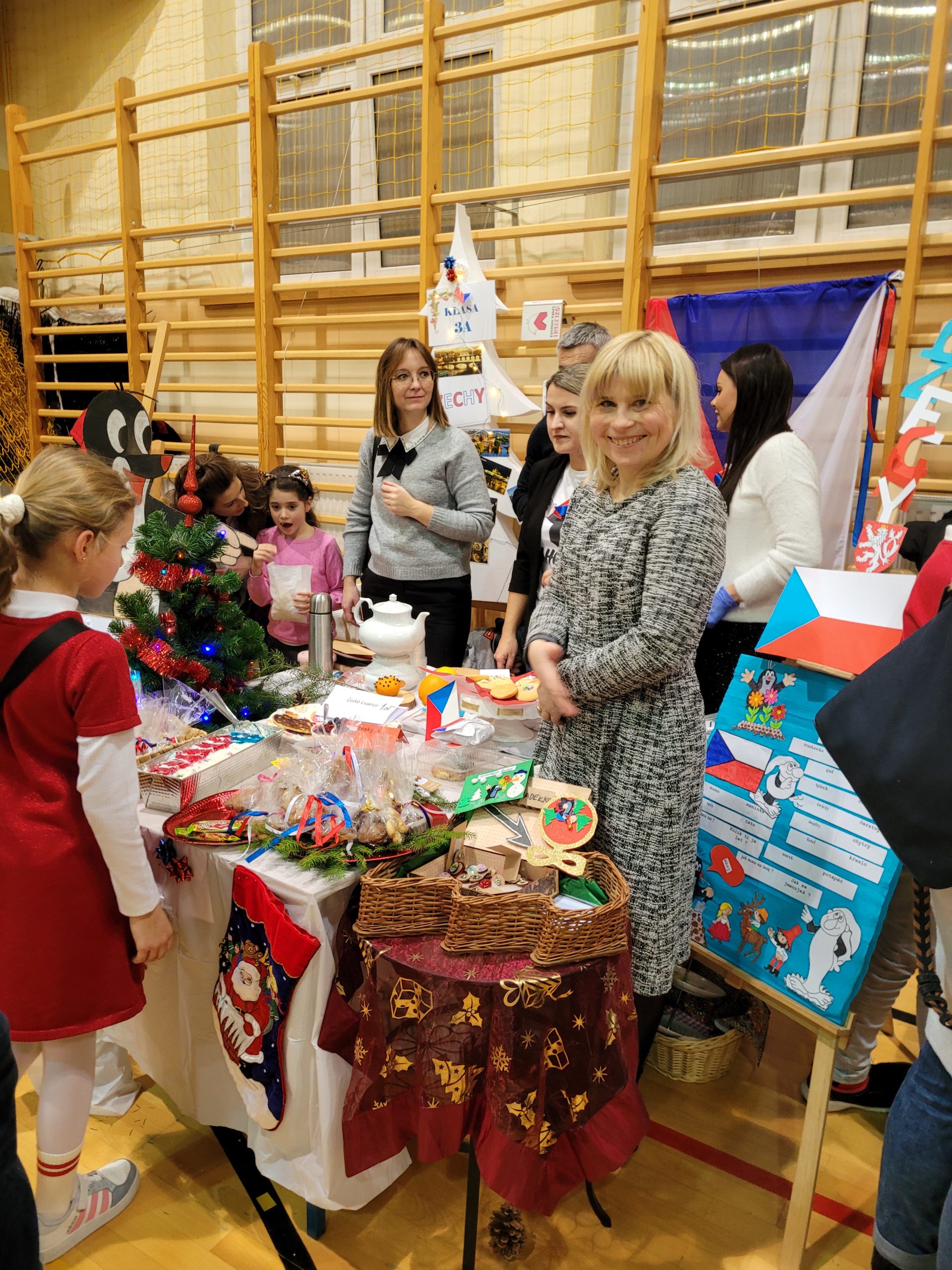 Po rozpoczęciu imprezy i przywitaniu wszystkich gości, oddaliśmy głos dziewczętom klas 8, które piosenką „Rockin’ Around the Christmas Tree” wprowadziły nas w prawdziwie świąteczny nastrój. Bez wątpienia ogromną atrakcją naszego festynu był korowód państw, w którym każda klasa prezentowała wybrany kraj i składała wszystkim świąteczne życzenia w ich języku. Po części artystycznej odbyliśmy kulinarną podróż dookoła świata, smakując potraw przygotowanych przez Rodziców naszych Uczniów na Kiermaszu Pyszności. Dodatkową atrakcją były warsztaty robienia świątecznych kartek z życzeniami z możliwością nadania ich dla naszej Siódemkowej Społeczności. Ogromnym zainteresowaniem cieszyła się również nasza Ścianka Gwiazdkowej Siódemki, na tle której odbywały się rodzinne i koleżeńskie sesje fotograficzne.