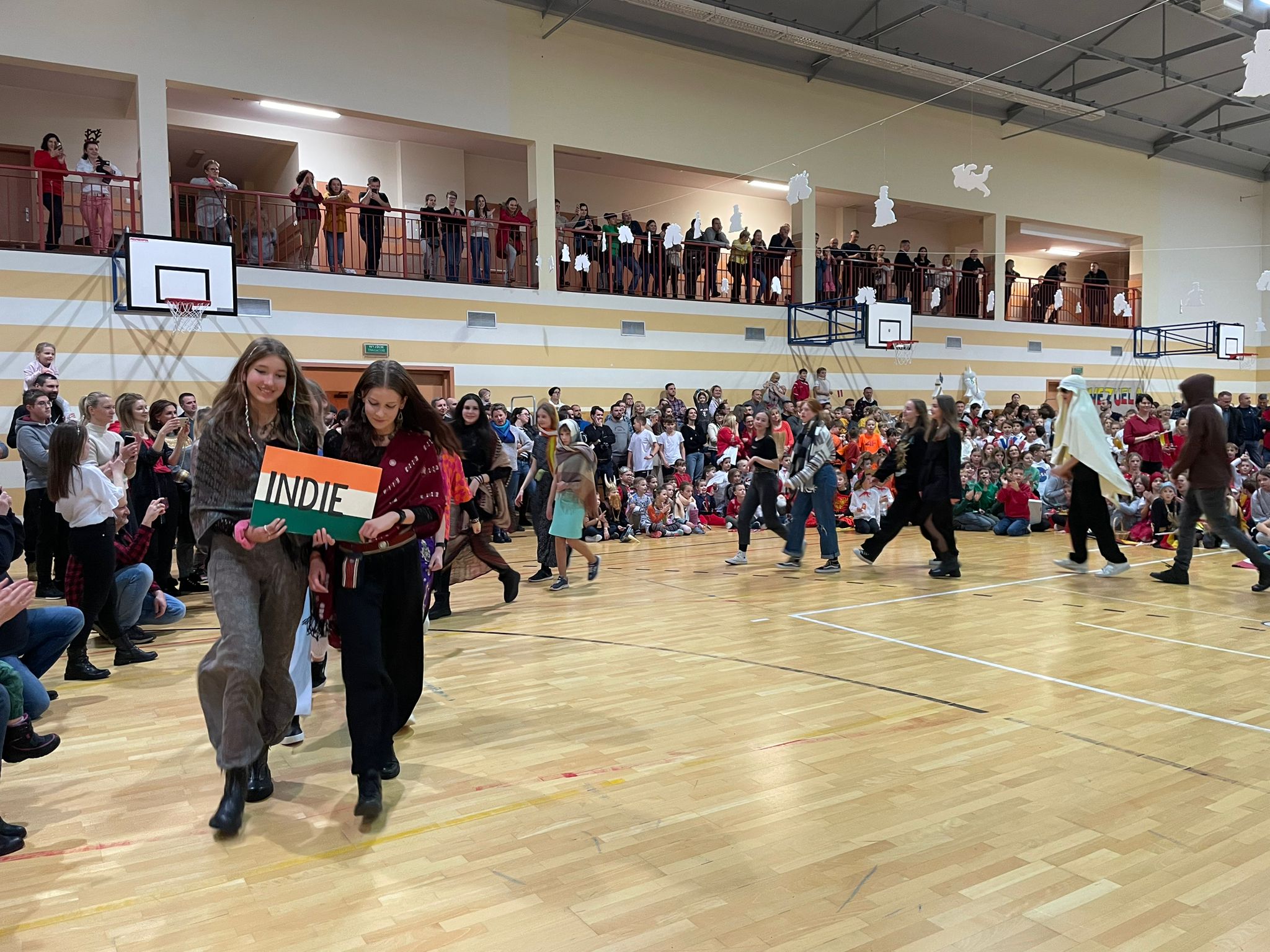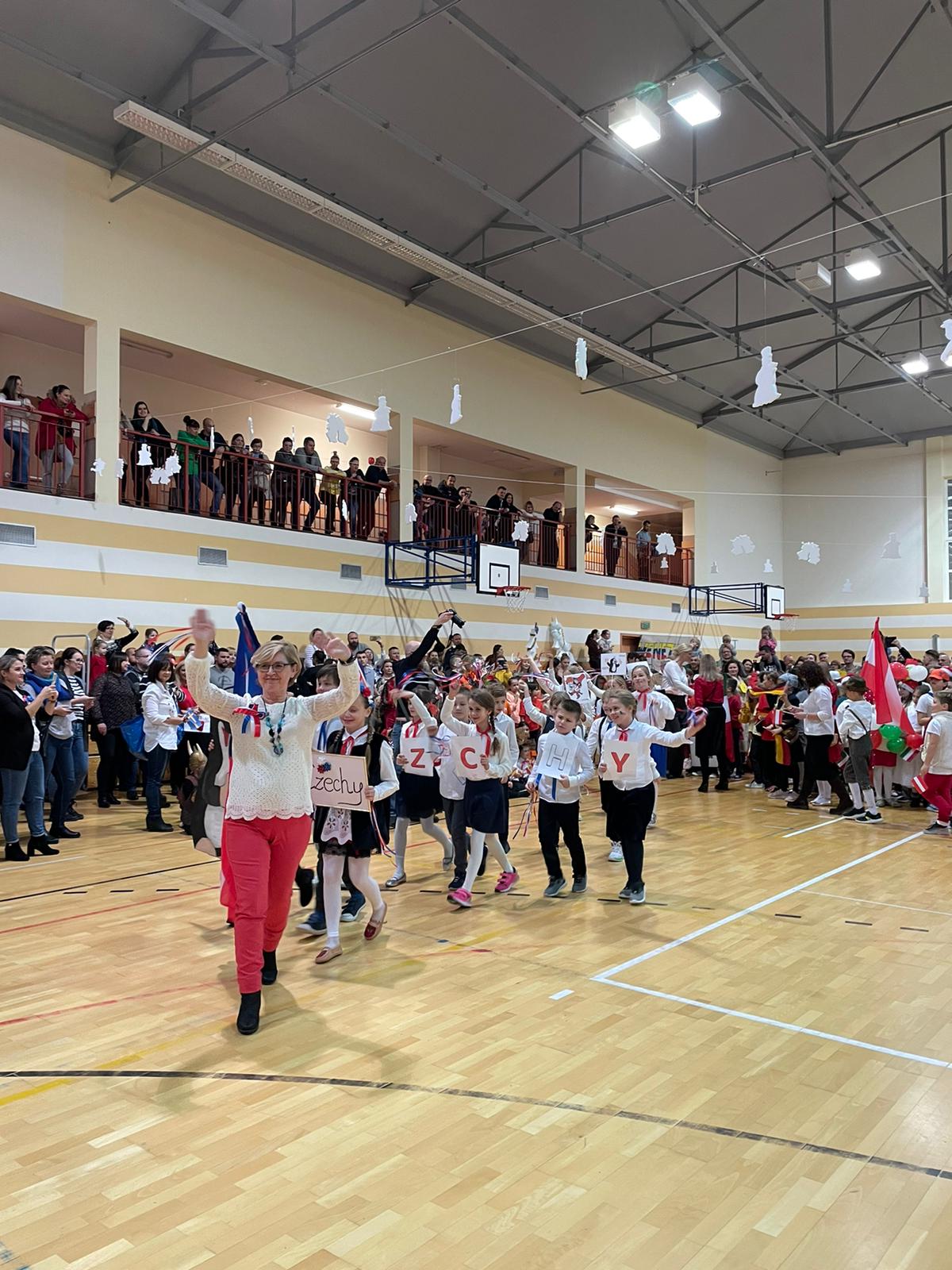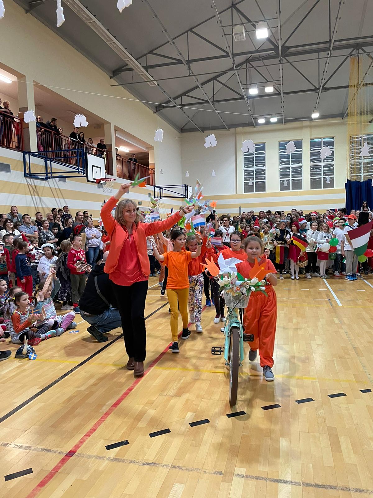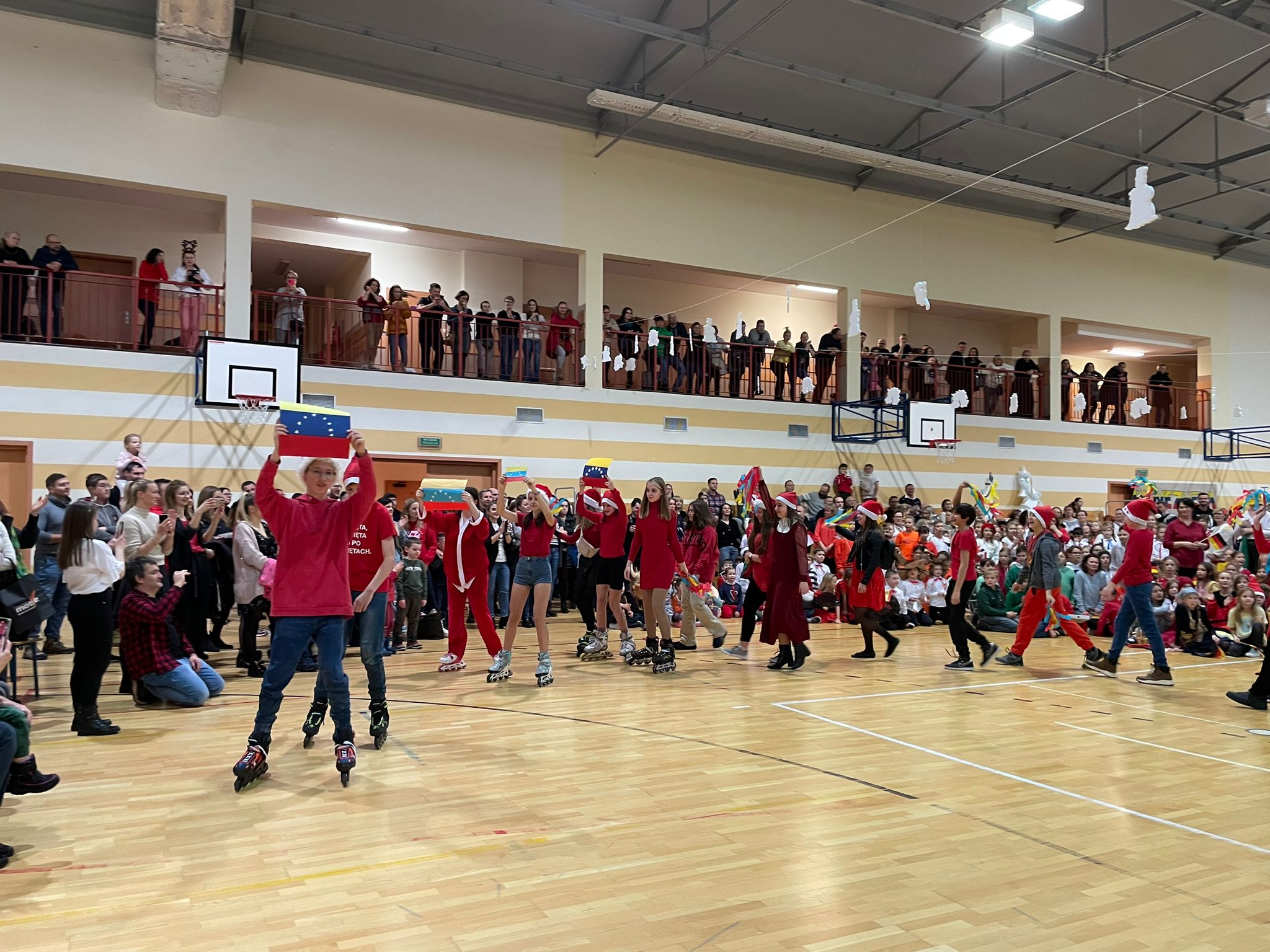 Po rozpoczęciu imprezy i przywitaniu wszystkich gości, oddaliśmy głos dziewczętom klas 8, które piosenką „Rockin’ Around the Christmas Tree” wprowadziły nas w prawdziwie świąteczny nastrój. Bez wątpienia ogromną atrakcją naszego festynu był korowód państw, w którym każda klasa prezentowała wybrany kraj i składała wszystkim świąteczne życzenia w ich języku. Po części artystycznej odbyliśmy kulinarną podróż dookoła świata, smakując potraw przygotowanych przez Rodziców naszych Uczniów na Kiermaszu Pyszności. Dodatkową atrakcją były warsztaty robienia świątecznych kartek z życzeniami z możliwością nadania ich dla naszej Siódemkowej Społeczności. Ogromnym zainteresowaniem cieszyła się również nasza Ścianka Gwiazdkowej Siódemki, na tle której odbywały się rodzinne i koleżeńskie sesje fotograficzne.