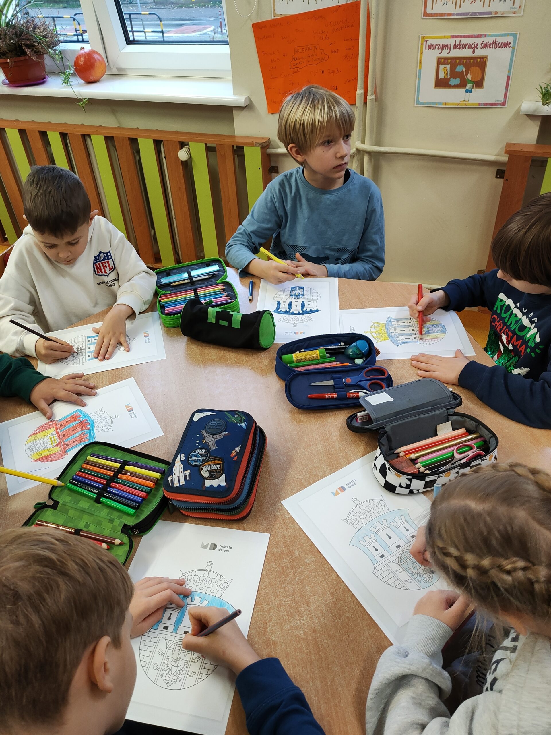 Świetliczaki pokolorowały herby poznanych stolic. Wykonywały karty pracy, takie jak wykreślanki, rebusy oraz układały zdania.