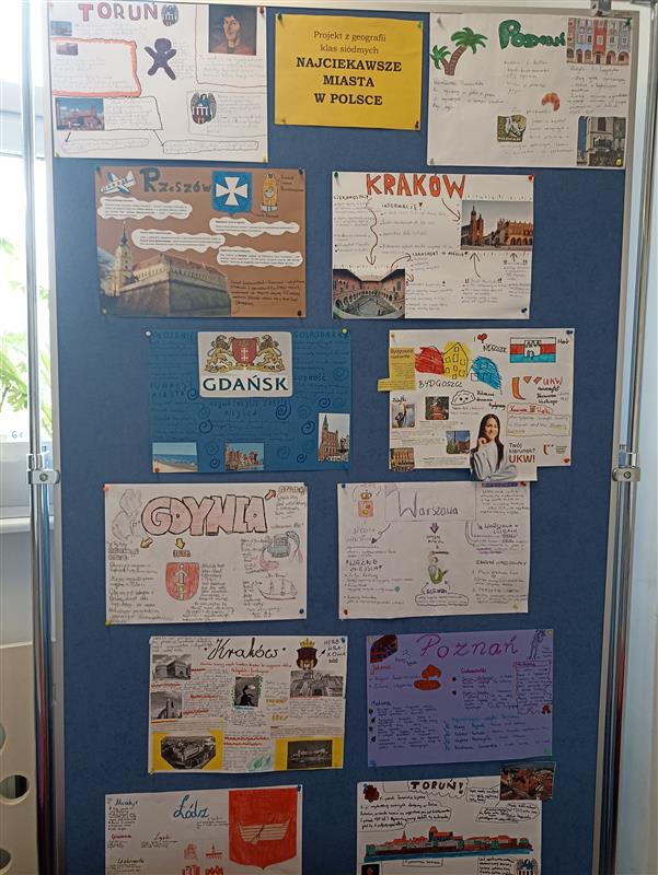Podczas lekcji geografii uczniowie klas siódmych pracowali nad projektem „Najciekawsze miasta w Polsce”. Na początku został wyjaśniony cel zadania – poznanie najciekawszych informacji o polskich miastach. Uczniowie korzystali z podręczników, wydrukowanych materiałów lub własnych notatek, aby zebrać potrzebne informacje. Główna część lekcji to praca twórcza. Uczniowie tworzyli plakaty: pisząc krótkie opisy, dodając ciekawostki, przyklejając zdjęcia oraz ozdabiając swoje prace rysunkami i kolorowymi elementami. Dzięki temu uczniowie zdobywali wiedzę, ale też rozwijali kreatywność.