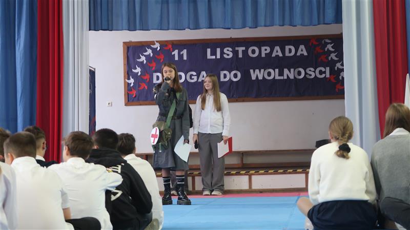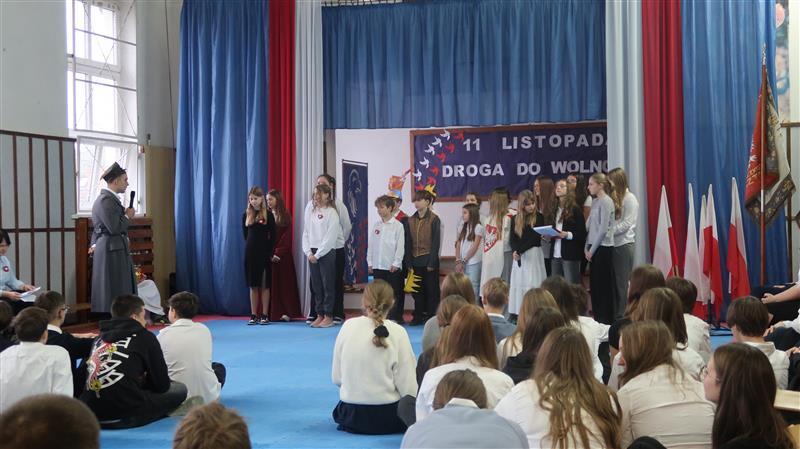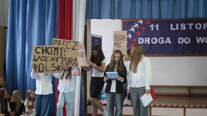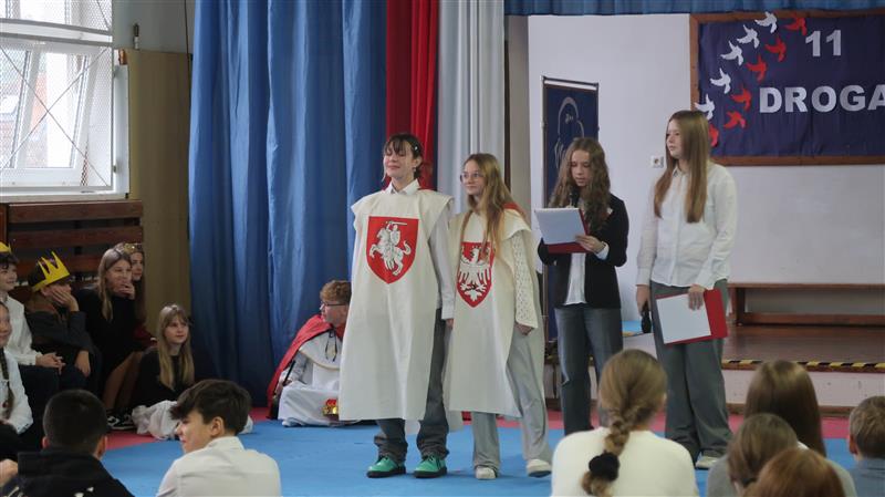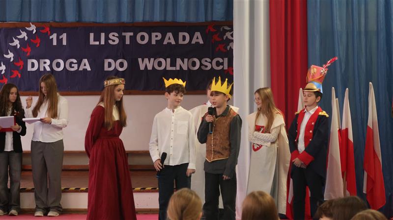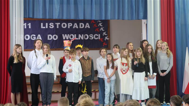 Grupa uczniów stoi w szeregu. Kilka osób ma na sobie stroje księcia, biskupa, kadeta, Piłsudskiego. W rękach trzymają kartki z datami.W tle widać napis 11. listopada drogo do wolności. Wokół grupy widać niebieskie zasłony a na nich długie pasma tkaniny upięte w biało czerwoną flagę.