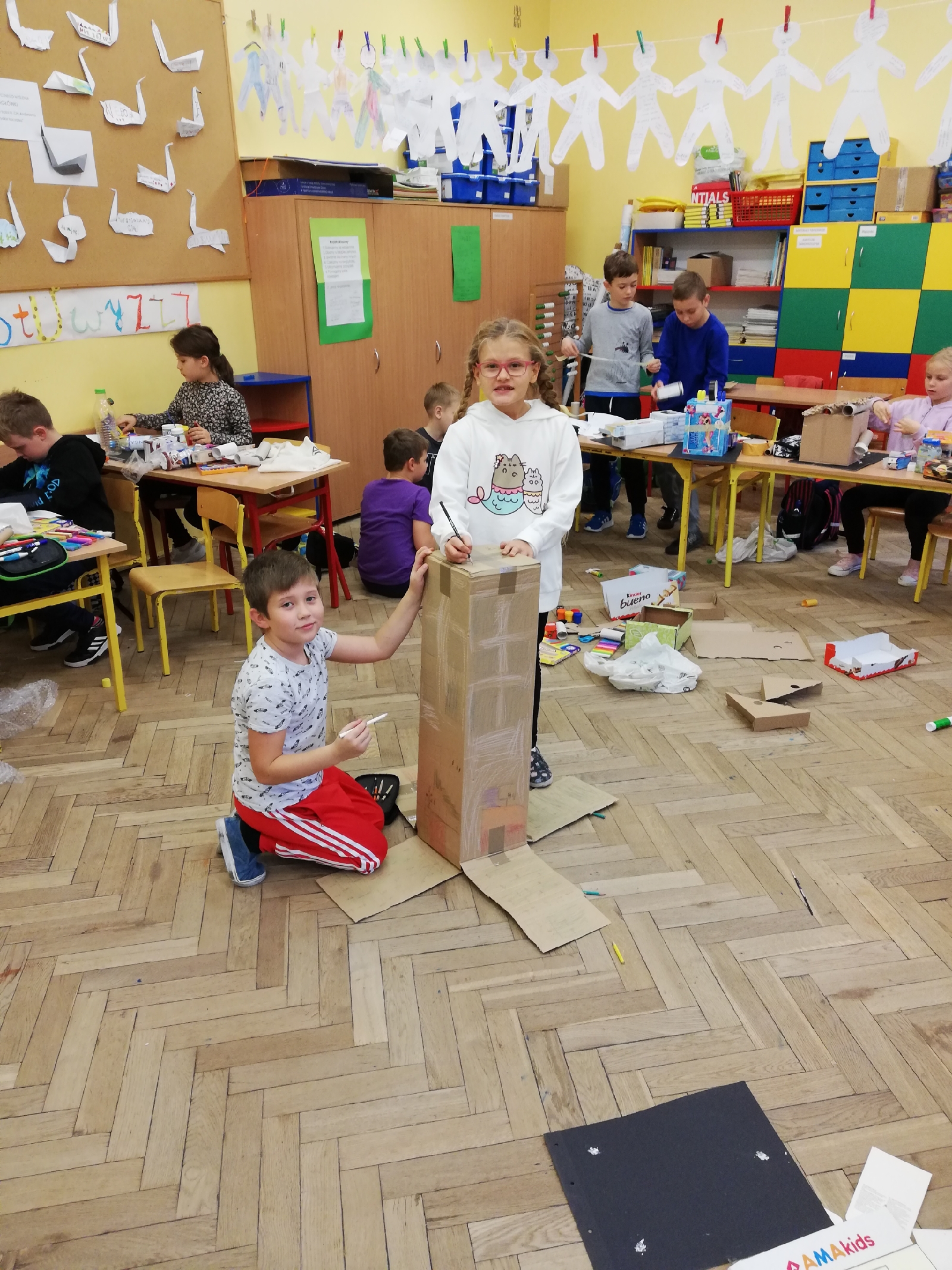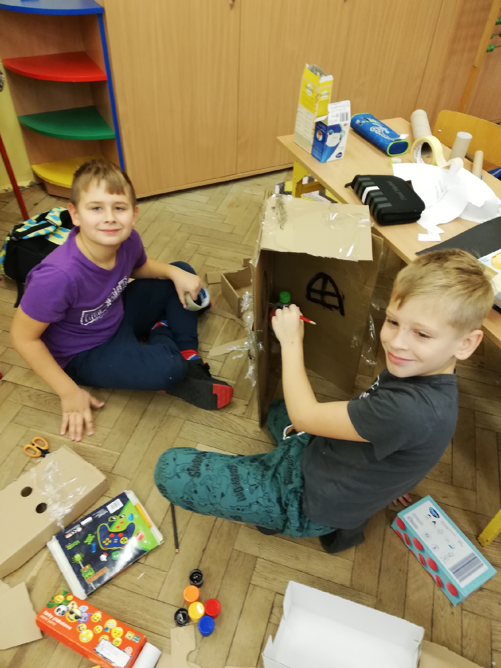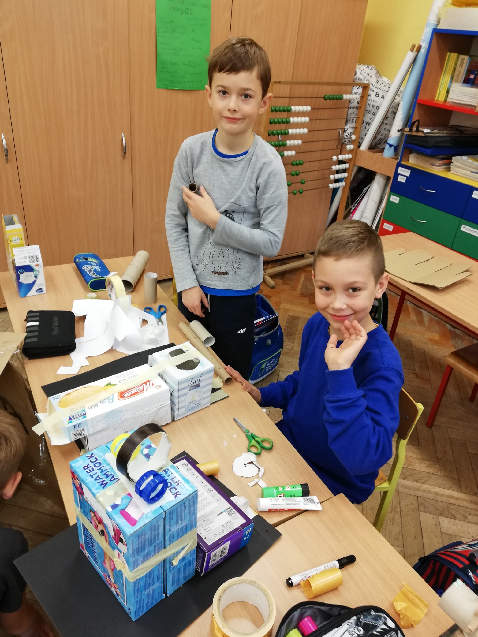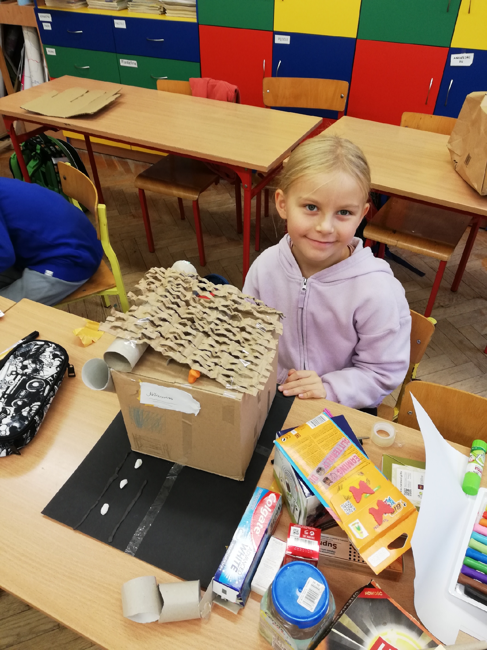 Kolejny etap naszej „podróży”, to wykonanie makiety Olsztyna z … materiałów odpadowych. Przygotowywaliśmy się do tego zadania kilkanaście dni, szukaliśmy informacji na temat wylosowanych obiektów, oglądaliśmy je z rodzicami na żywo.