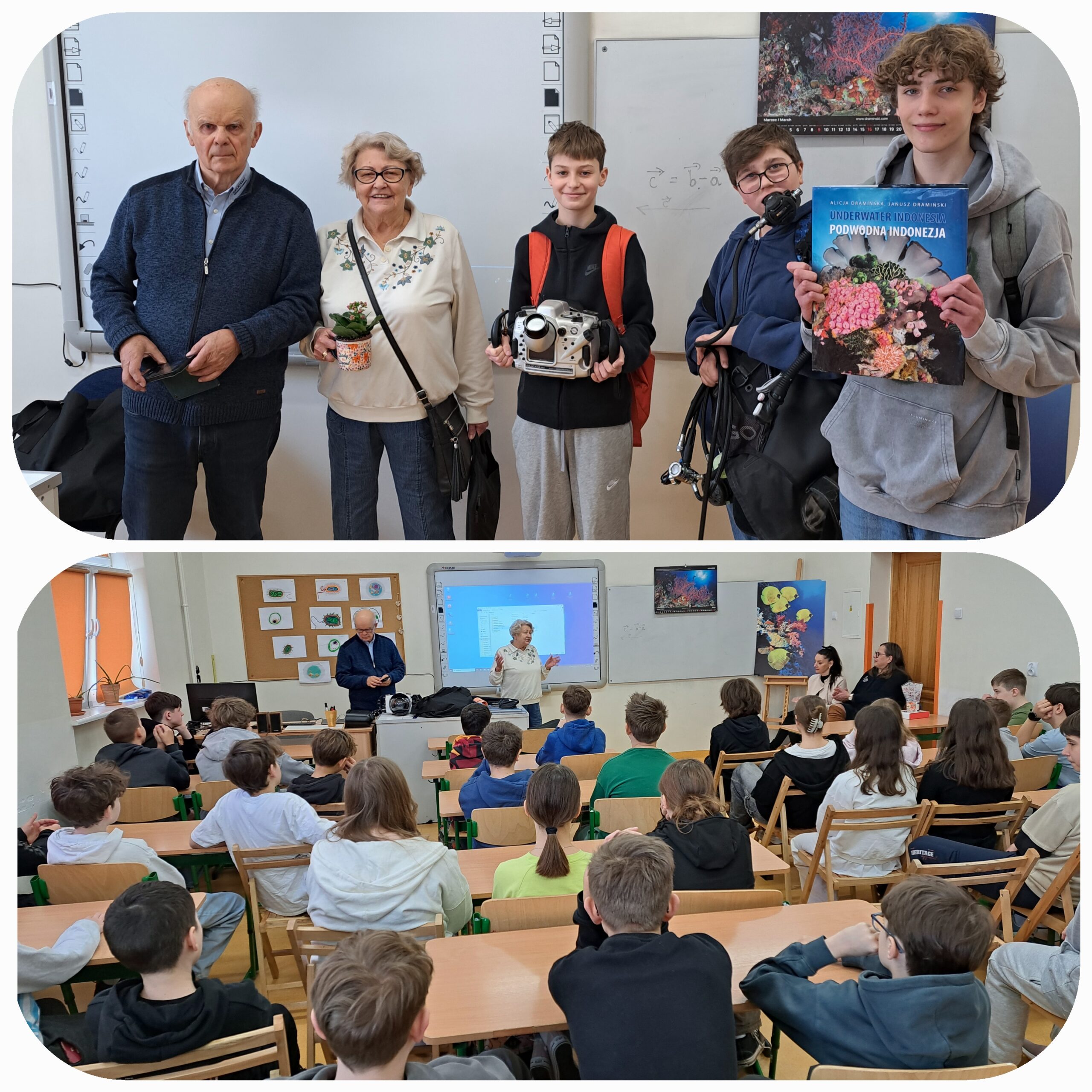 - odczyt dla kl. VI- ych z p. Alicją i Januszem Dramińskimi na temat „Indonezyjskiej rafy koralowej”, różnorodności podwodnego świata oraz zagrożeń i ochrony organizmów wodnych,