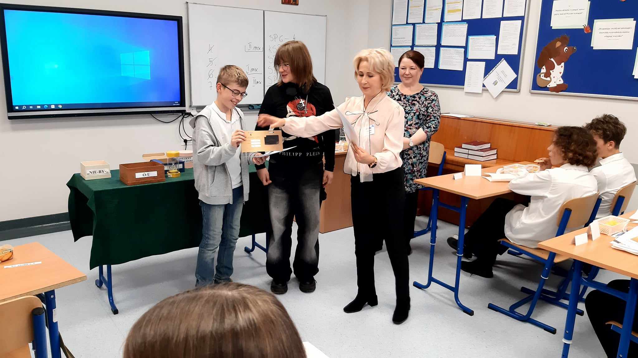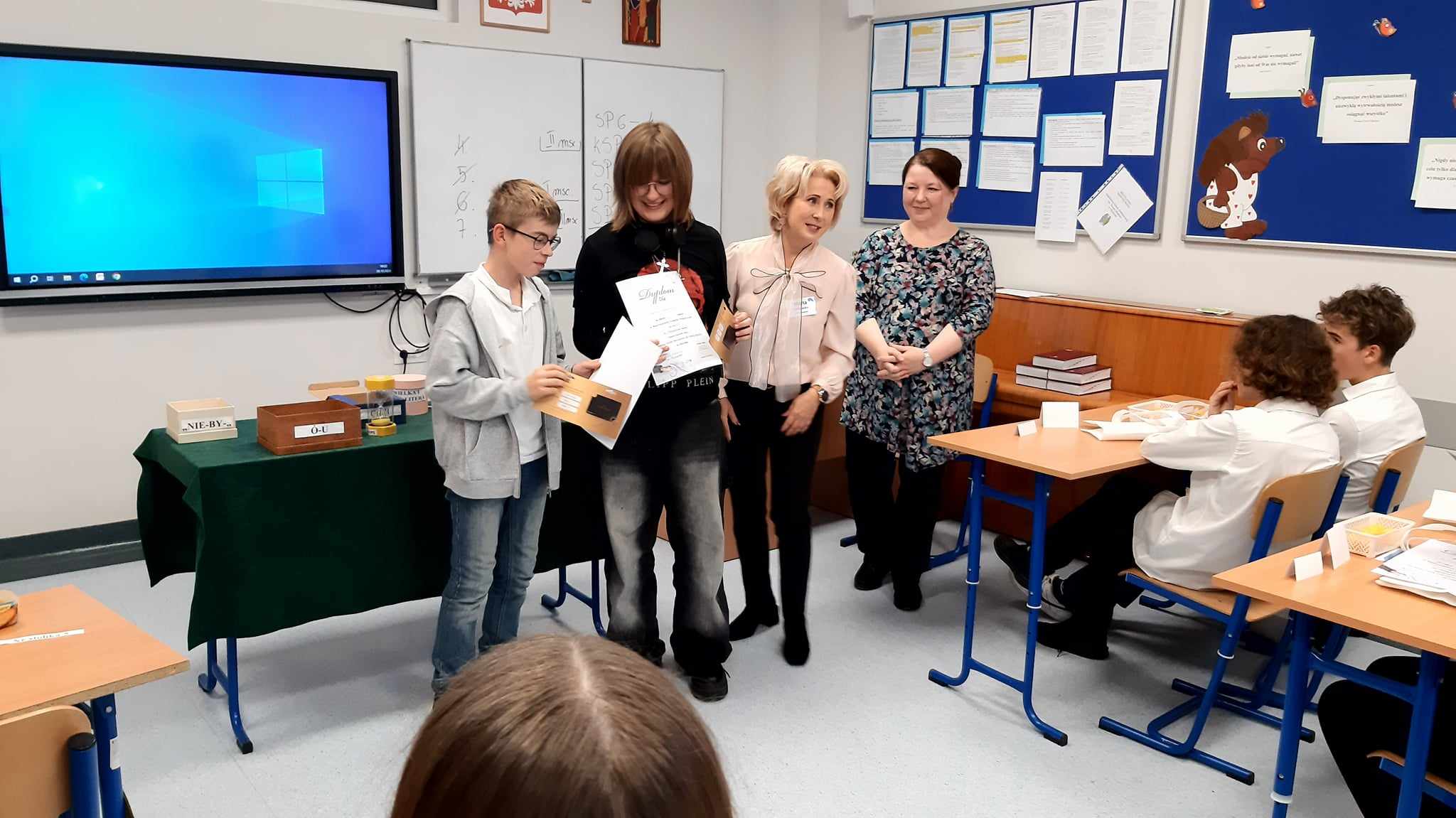 W piątek 28.10.2024 odbył się międzyszkolny konkurs ortograficzny międzyszkolny „Ruletka Ortograficzna”. Uczniowie klasy 7a stanęli do rywalizacji z uczniami z innych szkół, zmagając się z różnorodnymi, często trudnymi zadaniami ortograficznymi. Uczestnicy zadania konkursowe opracowywali w parach. Po zaciętej walce nasi reprezentanci dotarli do dogrywki. Ostatecznie udało im się zdobyć trzecie miejsce, co jest ogromnym osiągnięciem w tak wymagającej konkurencji.