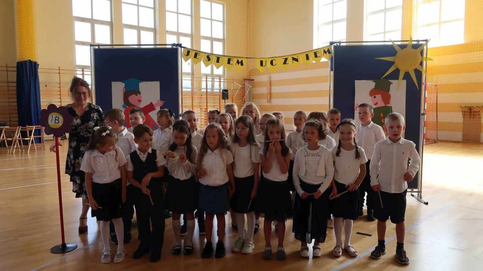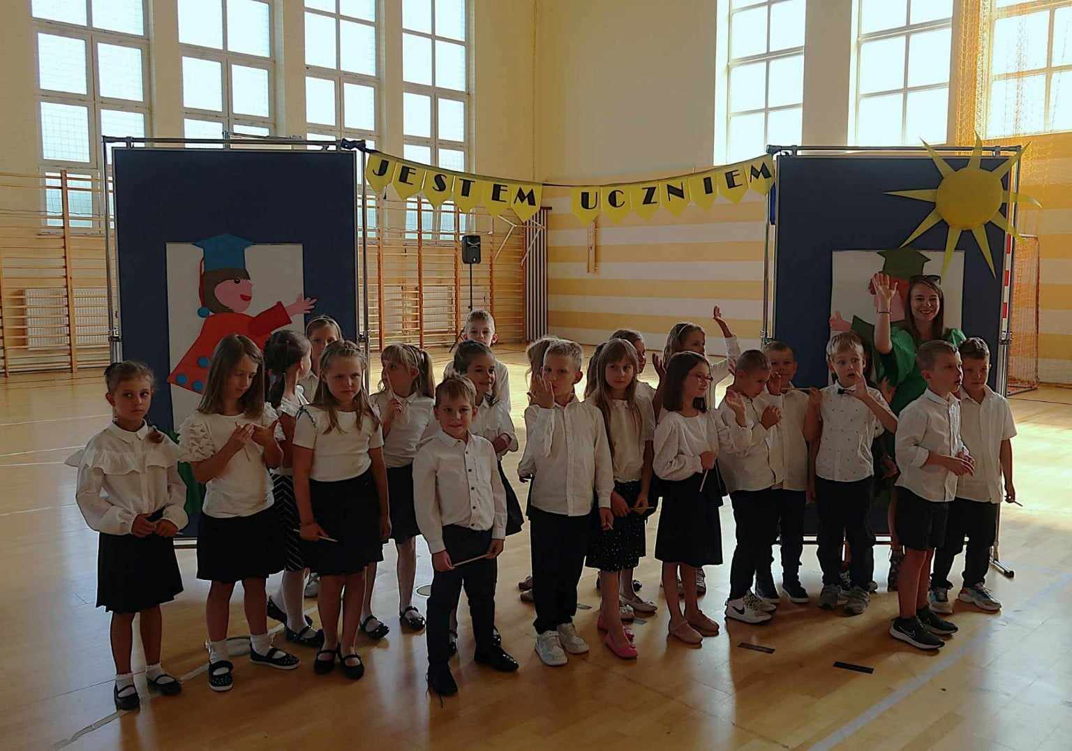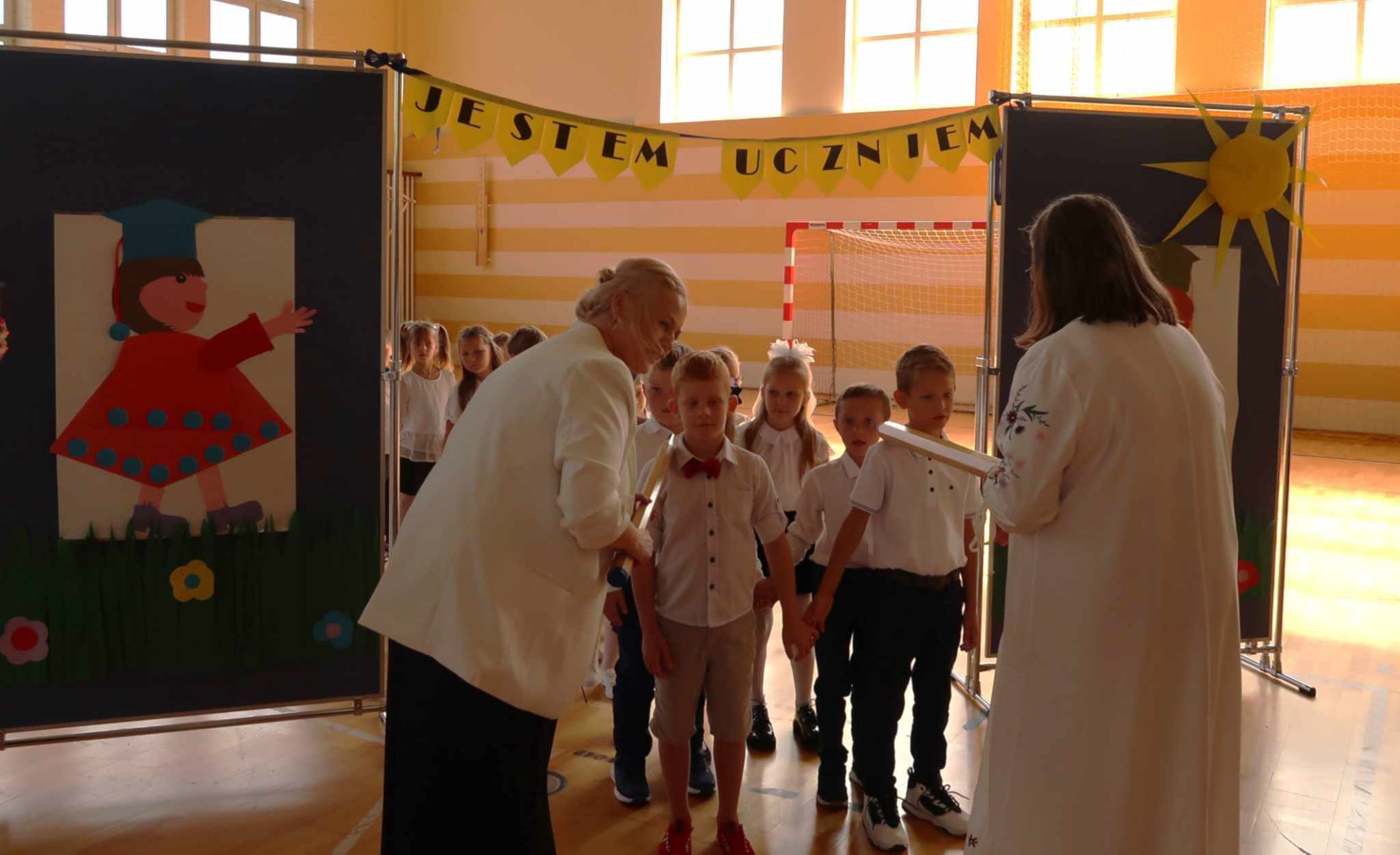 Na zdjęciu znajduje się grupa dzieci w sali gimnastycznej, podczas ceremonii szkolnej. Uczniowie są ubrani w eleganckie białe koszule oraz ciemne spódnice lub spodnie. Dzieci stoją w rzędach, a większość z nich unosi prawą rękę, bo składały przysięgę. W tle widać tablicę wyników sportowych oraz bramkę do gry w piłkę ręczną, co sugeruje, że wydarzenie odbywa się w hali sportowej. Przy dzieciach znajdują się nauczycielki, nadzorujące ceremonię. Pomieszczenie jest dobrze oświetlone, dzięki dużym oknom, które wpuszczają sporo naturalnego światła.
