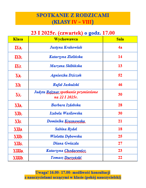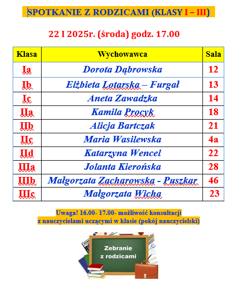 W dniach 22 oraz 23 stycznia 2025 roku odbędą się spotkania rodziców z wychowawcami. Zapraszamy.
