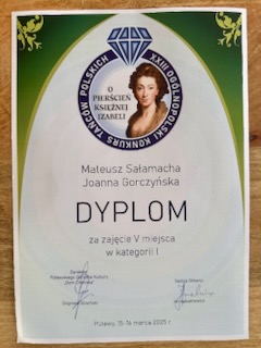 Na zdjęciu widać dyplom trzymany w dłoni przez osobę. Dyplom został przyznany Mateuszowi Sałamacha i Joannie Gorczyńskiej za zajęcie V miejsca w kategorii I podczas Ogólnopolskiego Konkursu o „Pierścień Księżnej Izabeli”. W tle na scenie występują dzieci ubrane w stroje taneczne – dziewczynka w czerwonej sukience, a chłopcy w białych koszulach i kamizelkach.