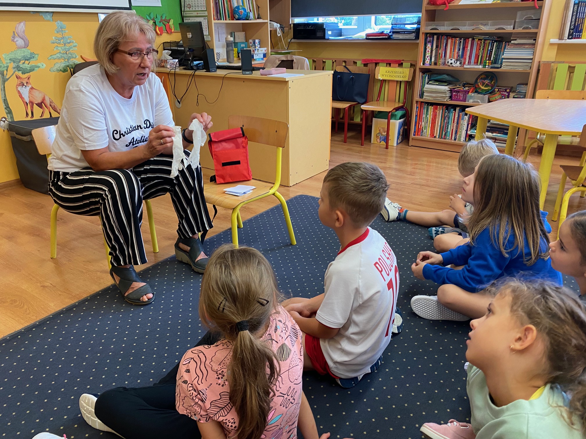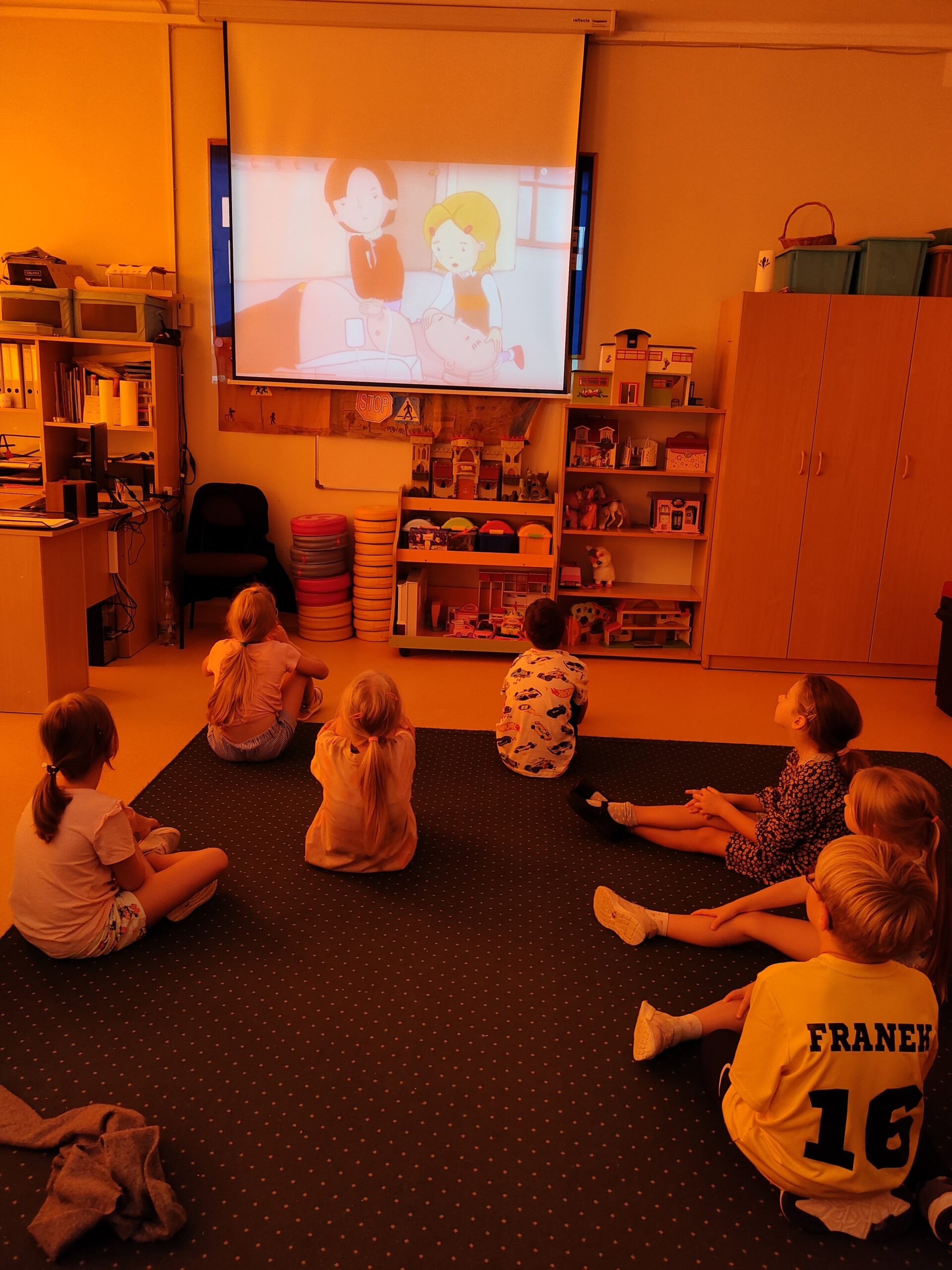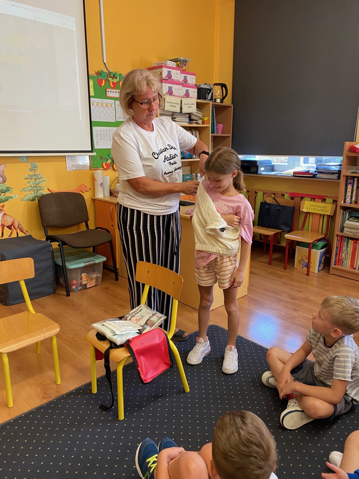 Zdjęcie przedstawia siedzące w świetlicy dzieci. Dzieci siedzą tyłem, ubrane są w kolorowe ubrania. Patrzą na stojącą przodem panią pielęgniarkę. Trzyma ona w rękach czerwoną torbę - apteczkę pierwszej pomocy. Ściany świetlicy są koloru żółtego. Wiszą na nich kolorowe gazetki ścienne a na podłodze stoją szafki z kolorowymi zabawkami.