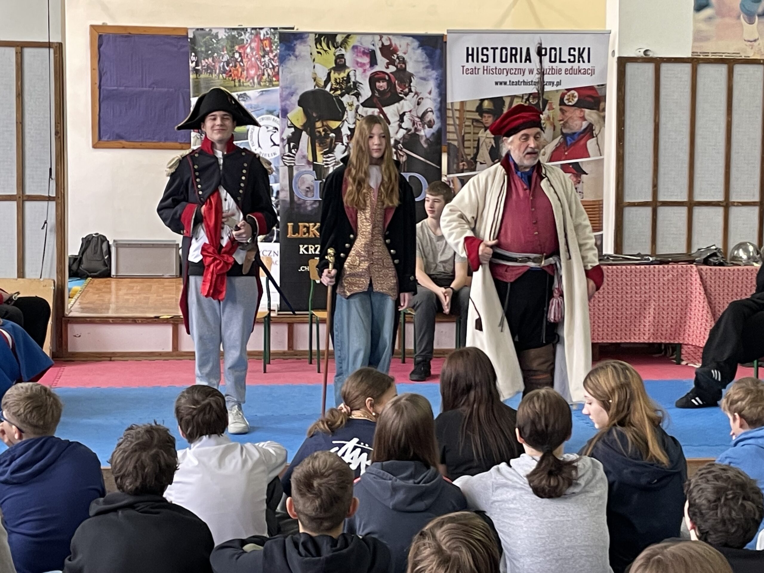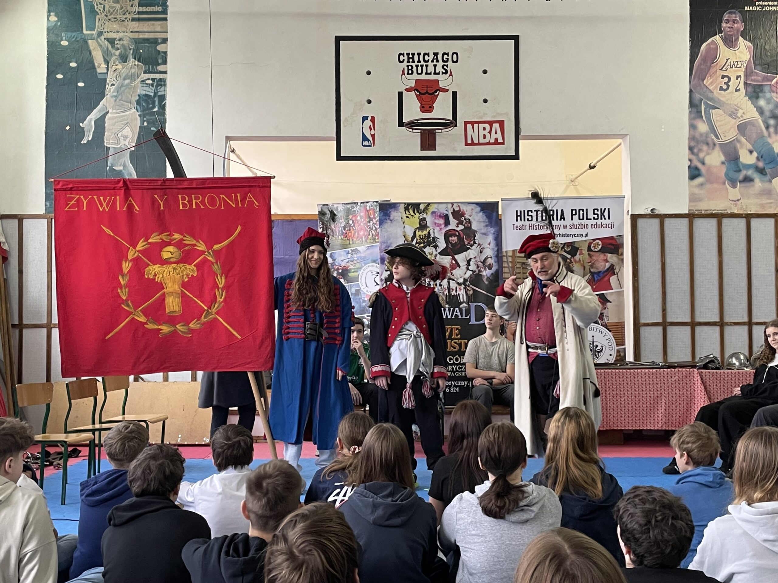 Ostatnio odwiedzili nas panowie z Teatru Historycznego Chorągiew Komturstwa Gniewskiego. Z ich pomocą siódmoklasiści przenieśli się w XIX wiek. Mogli wcielić się w role wielu postaci historycznych takich jak: Tadeusz Kościuszko, kosynierzy, Napoleon, Józef Wybicki, Piotr Wysocki, powstańcy styczniowi, Józef Piłsudski.
