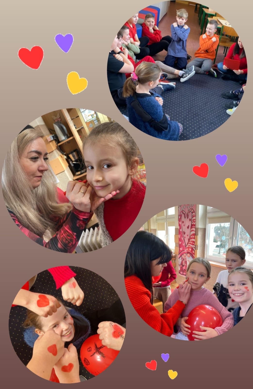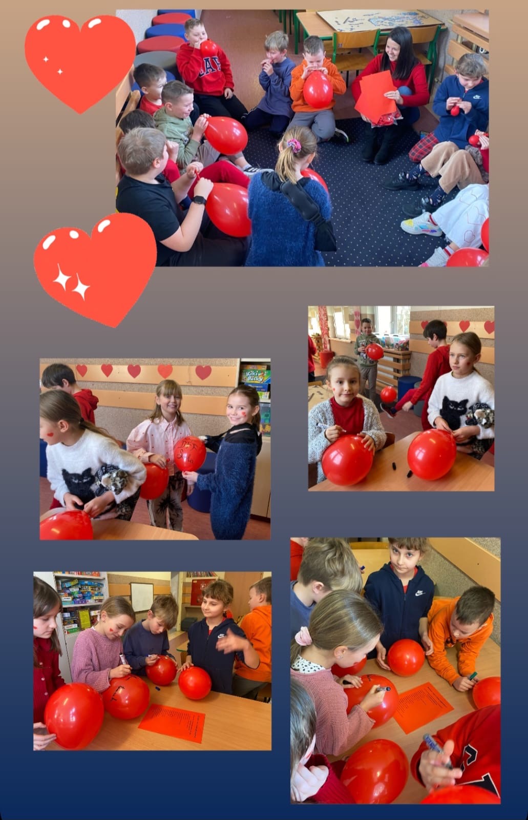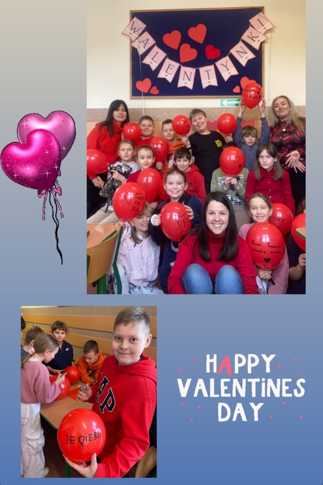 Zdjęcie przedstawia grupę dzieci świętujących Walentynki w szkolnej sali lub świetlicy. W tle widoczna jest dekoracja na tablicy korkowej z napisem „WALENTYNKI” oraz czerwonymi sercami, które podkreślają walentynkowy klimat. Na głównym zdjęciu dzieci siedzą razem, trzymając czerwone balony z napisami, takimi jak „LOVE YOU”. Mają różne stroje, ale dominują czerwone i różowe elementy ubioru, nawiązujące do walentynkowej atmosfery. Na dolnym, okrągłym zdjęciu widać dzieci w trakcie zabawy z balonami – niektóre nadmuchują je, inne trzymają w rękach. Sala jest udekorowana serduszkami, a podłoga i ściany mają ciepłe, beżowo-brązowe barwy. Całość jest ozdobiona grafikami w postaci różowych serc oraz napisem „HAPPY VALENTINE’S DAY”, co dodatkowo podkreśla tematykę święta.